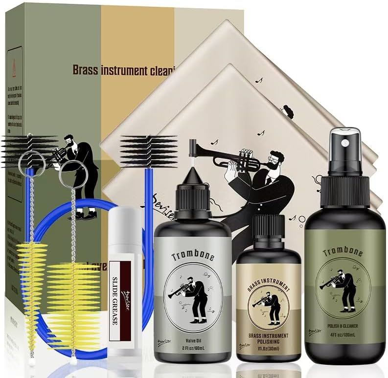Comprehensive Cleaning & Maintenance Kit:This Trombone ALL IN ONE Cleaning kit includes a polishing,valve oil, two specialized cleaning cloths, Slide grease, and a cleaning brush, covering all your needs for daily cleaning and maintenance of your trumpet, keeping your instrument in optimal condition at all times.