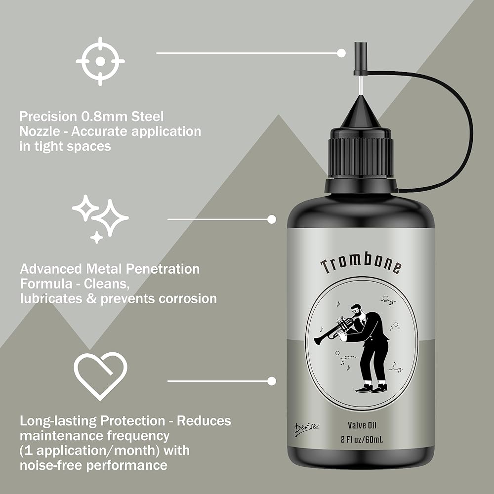 Premium Valve Oil:Selected with care, this premium valve oil is specifically designed for trombone valves, reducing friction, preventing corrosion, ensuring smooth valve operation, and enhancing your playing experience.