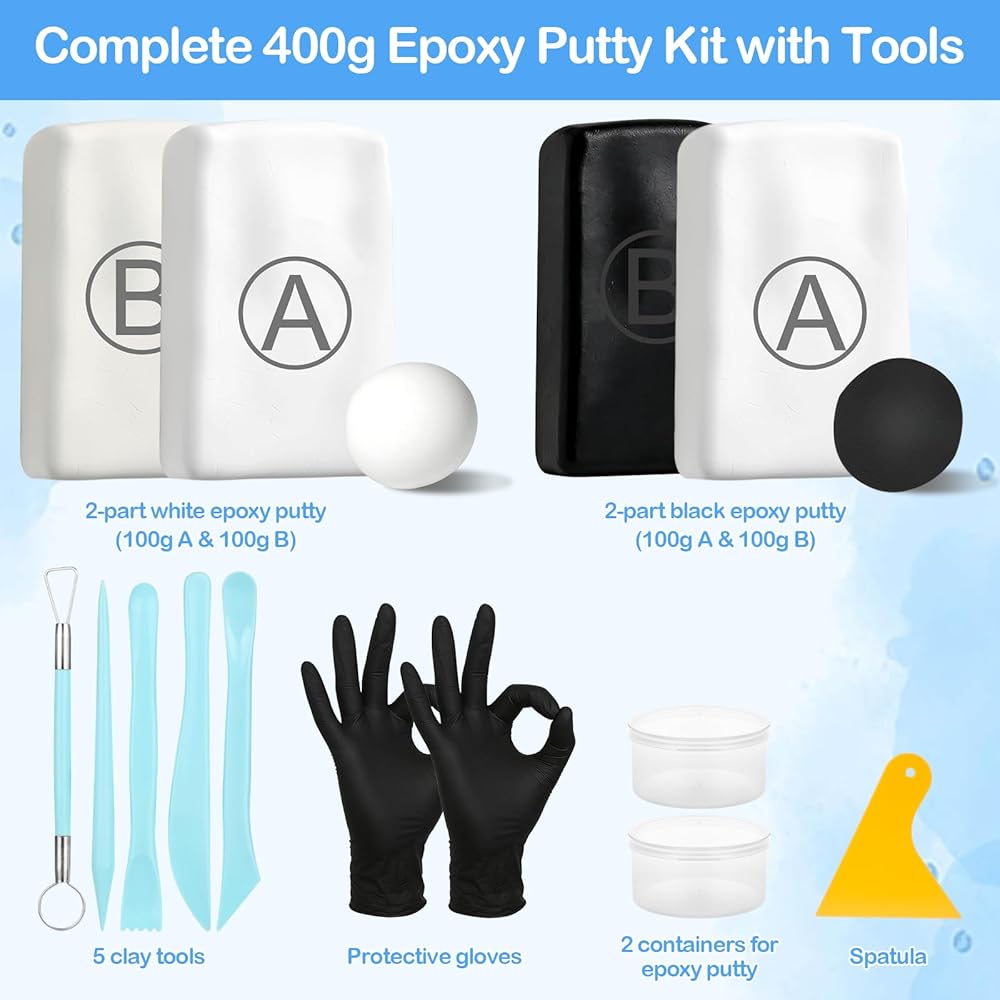 【Product Contents】This comprehensive epoxy repair kit contains two complete sets of 2-part epoxy putty, available in both black and white. It also includes five professional-grade clay tools for shaping and detailing, one sturdy scraper for surface application, and one pair of protective gloves. Every component is chosen to support a wide range of tasks—from sculpting and modeling to heavy-duty home and industrial repairs—providing users with everything needed to start projects immediately.