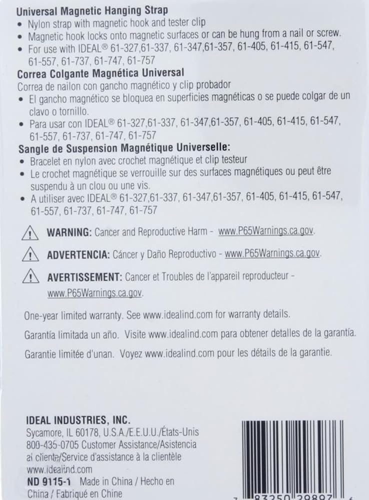 The Universal Magnetic Hanging Strap helps free up a hand during testing. Compatible with many of IDEAL's testers including Multimeters and Clamp Meters, the strap features a hook that locks onto magnetic surfaces such as electrical panels or metal studs. It can also be hung from a nail or screw.