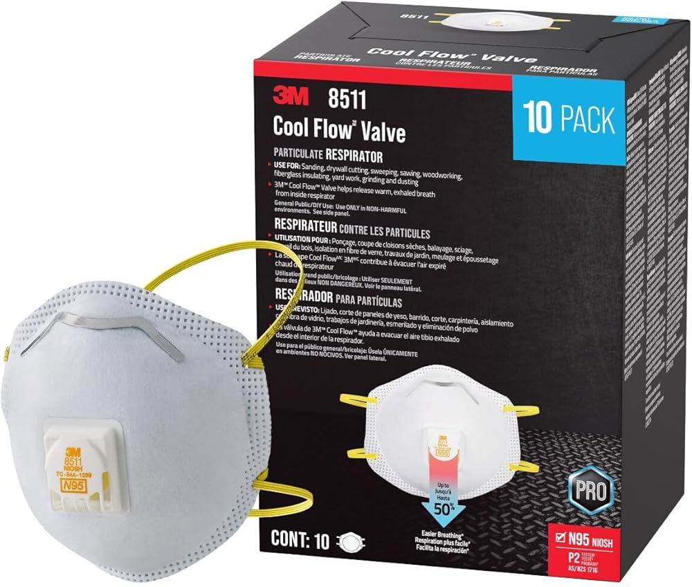 Part of our Pro Series, the 3M Cool Flow Valve Particulate Respirator 8511 is designed with the pro in mind to help bring you protection and comfort. The Cool Flow Exhalation Valve helps release warm and moist exhaled breath from inside the respirator. This N95 respirator features Advanced Electrostatic Media that enhances the capture of airborne particles and is designed for easy breathing. An adjustable M-noseclip helps provide a custom, secure seal. Whether you're hanging drywall or sanding a floor, rely on the trusted protection of the 3M Cool Flow Valve Particulate Respirator 8511.