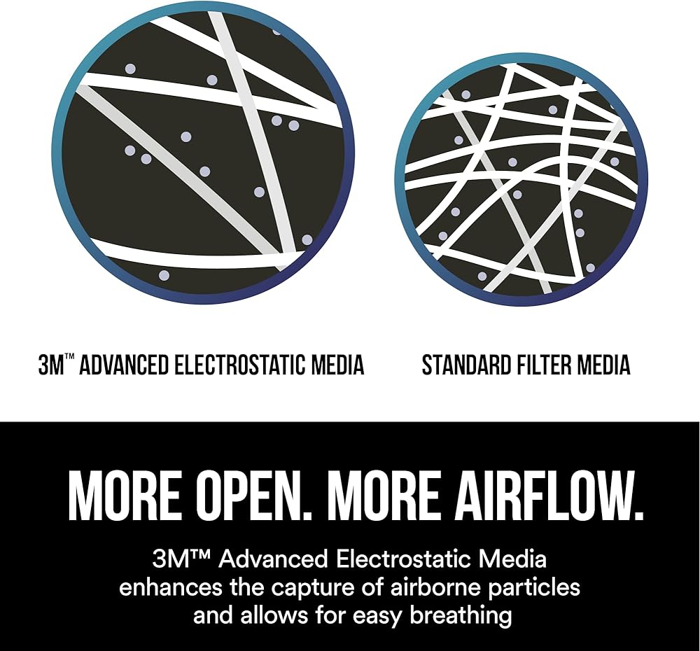 3M ADVANCED ELECTROSTATIC MEDIA enhances the capture of airborne particles and allows for easy breathing