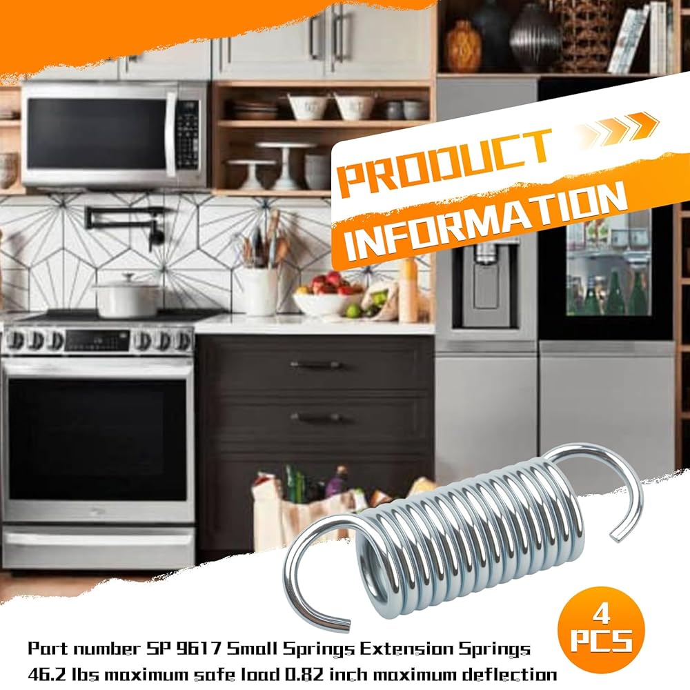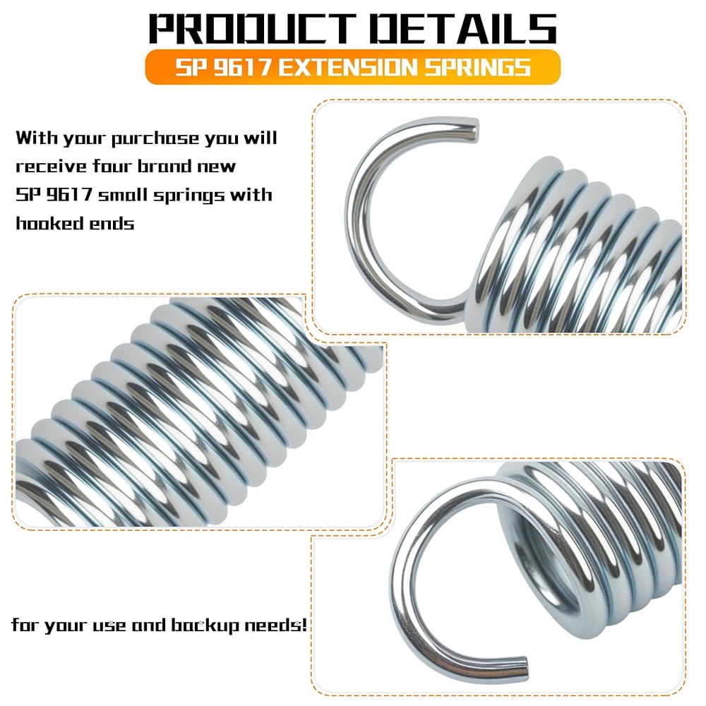 Product Information: Part Number 9617, Small Spring, Extension Spring, Dimensions: 2.64 inches × 0.75 inches × 0.6 inches. Your purchase includes 4 brand new 9617 small springs with hook ends for use and backup.