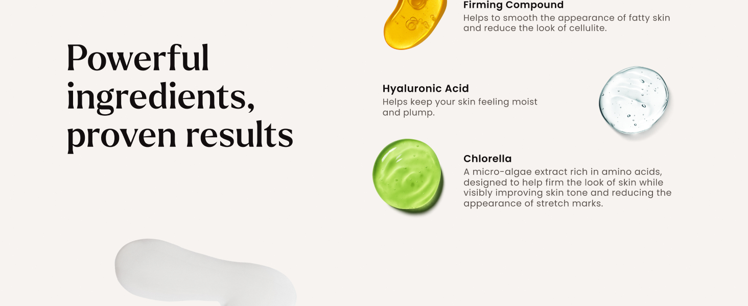 Powered by Hyaluronic Fusion & Chlorella - Formulated with Hyaluronic Fusion Technology, Symfit, and Chlorella Vulgaris extract, this cellulite treatment helps smooth the look of uneven texture and diminish the appearance of stretch marks.