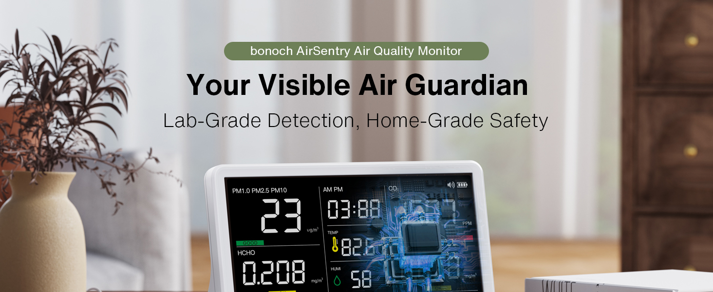 【16-in-1 Air Quality Monitor Indoor】 Ensure healthier indoor air with bonoch's AirSentry 16-in-1 Air Quality Monitor, your ultimate indoor air quality monitor for home. Tracks 9 essential parameters in real-time, including CO2 (CO2 monitor), PM2.5/PM1.0/PM10, HCHO(Formaldehyde detector), TVOC (voc monitor), Temperature, Humidity, AQI, and Time. With 7 customizable AQI alert alarms, this advanced air quality tester keeps your home's air safe and healthy