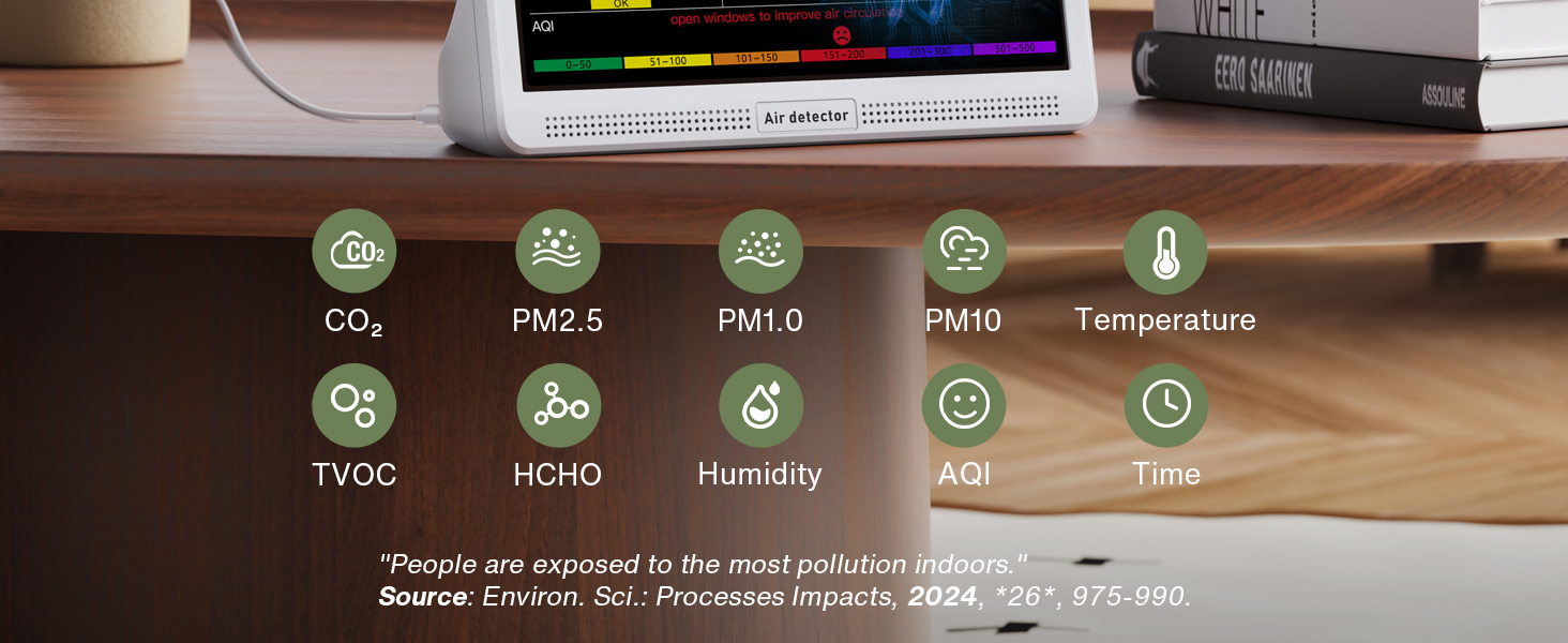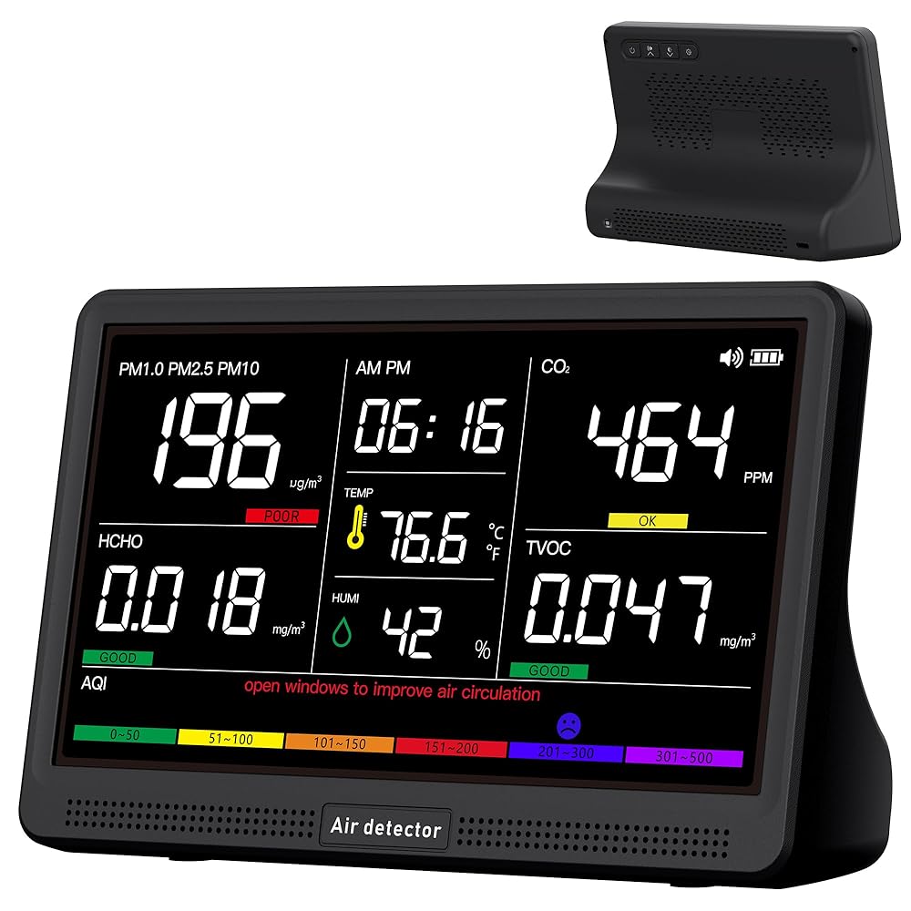 【Real-Time AQI Alerts with 7 Warning Buzzers】 Stay protected with instant pollutant alerts for CO2, PM2.5/PM1.0/PM10, HCHO, TVOC, and AQI. The 7 distinct alarm modes on this air quality monitor indoor ensure you're always informed—plus, a handy mute button lets you silence alerts when needed