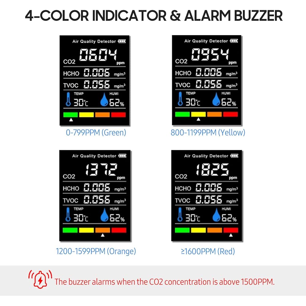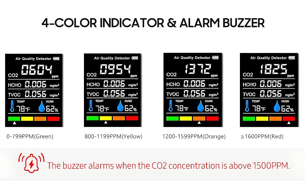 【Smart LED Color Screen】 Air quality tester equipped with a high-definition color screen for real-time data display, making it clear and easy to read. It provides an overall assessment of environmental quality and tracks the average value of each gas, helping you quickly identify unsafe gases in the air. In alarm mode, the screen changes color to remind you to pay attention to the environment.