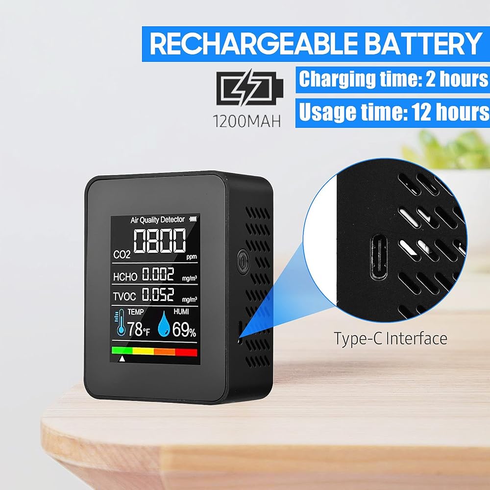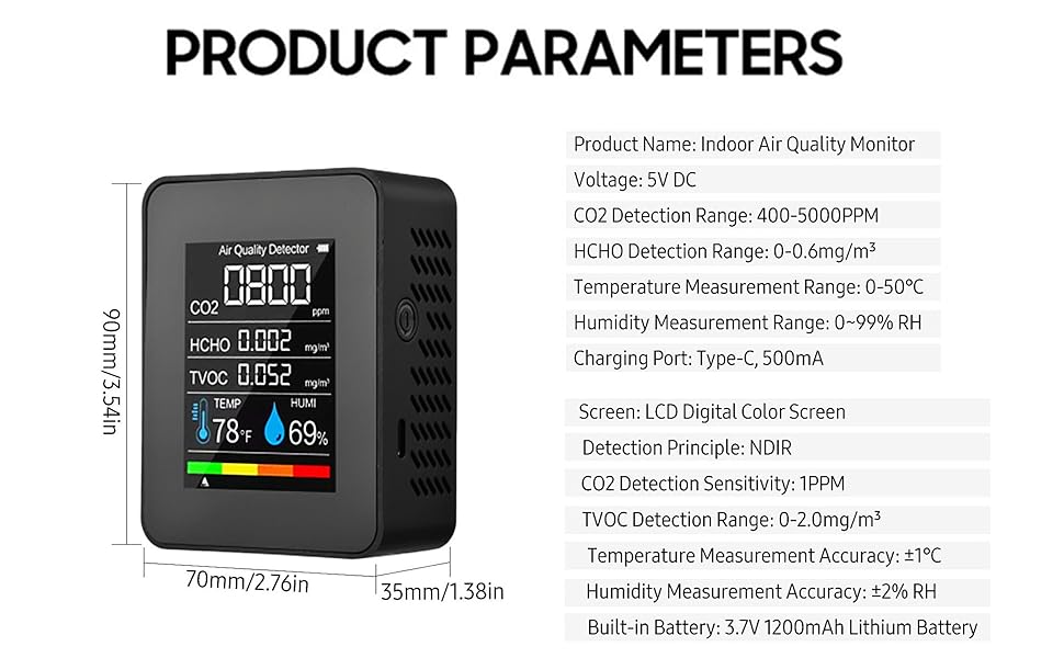 【Long-Lasting Battery, Portable Design】 Air monitor equipped with a built-in 1200mAh rechargeable lithium battery and a USB charging cable, it can last up to 8 hours on a single charge. Its lightweight and portable design make it suitable for various scenarios.