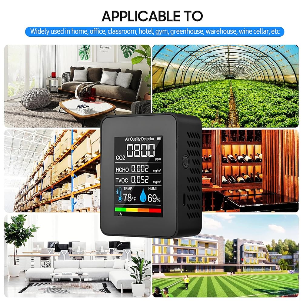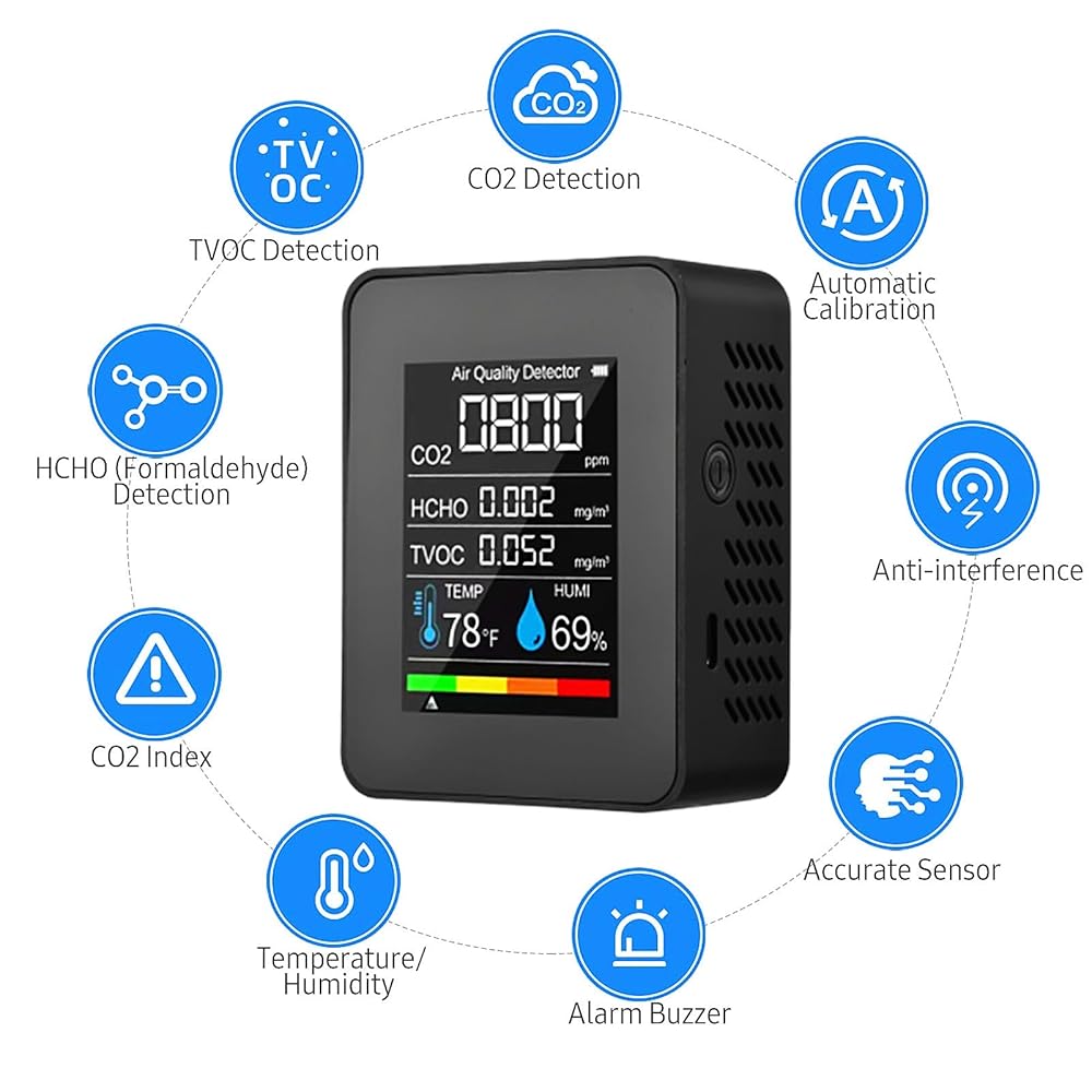 Prefessionall Indoor Air Quality Monitor, 5 in 1 Portable Smartair Quality Tester for CO2 | TVOC | HCHO | Temp | Hum for Home Cars Plants and Pets So On (Black)