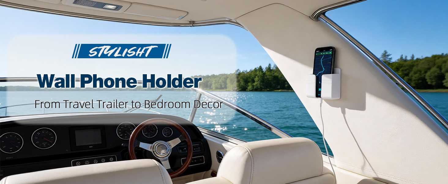Boat Accessories:With strong adhesive and wide compatibility,the phone wall mount serves as cruise essentials 2026,a boat phone holder for pontoon,and a phone holder for wall among your camper van accessories—securing phones firmly even on bumpy roads