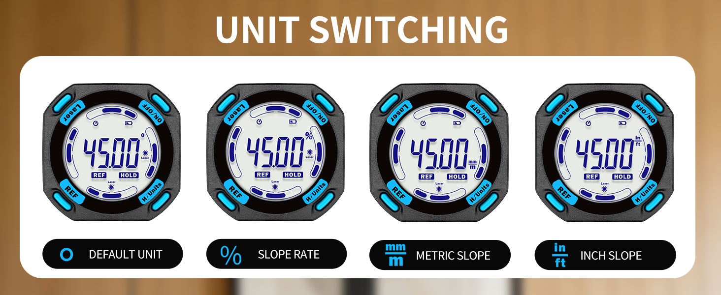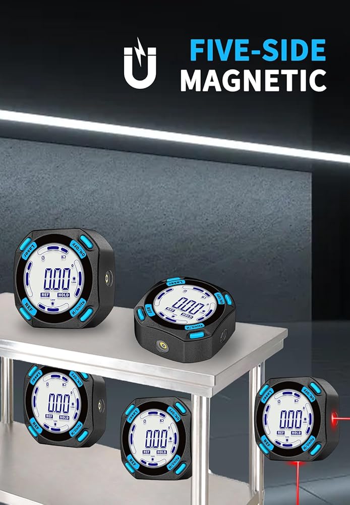 FIVE SIDES STRONG MAGNETIC — Digital laser level has strong magnets on five sides that firmly adsorb on the measuring object, ensuring accuracy and not easily falling off. Four easily operated buttons can activate the built-in red laser line on both sides, hold the measured value, switch the unit of the measured value and zeroing function to realize relative measurement.