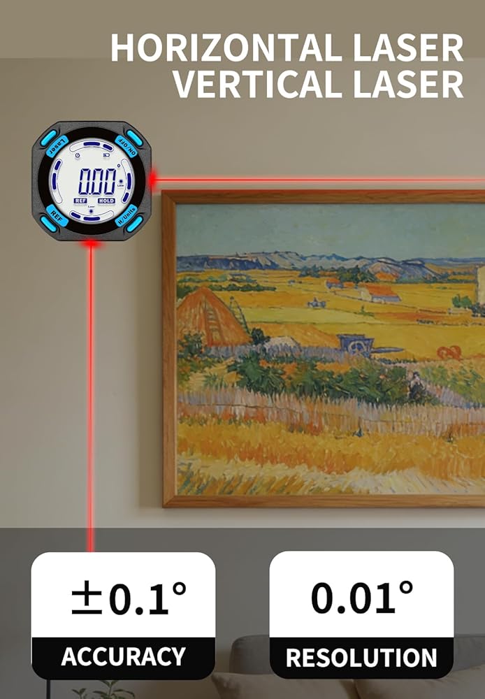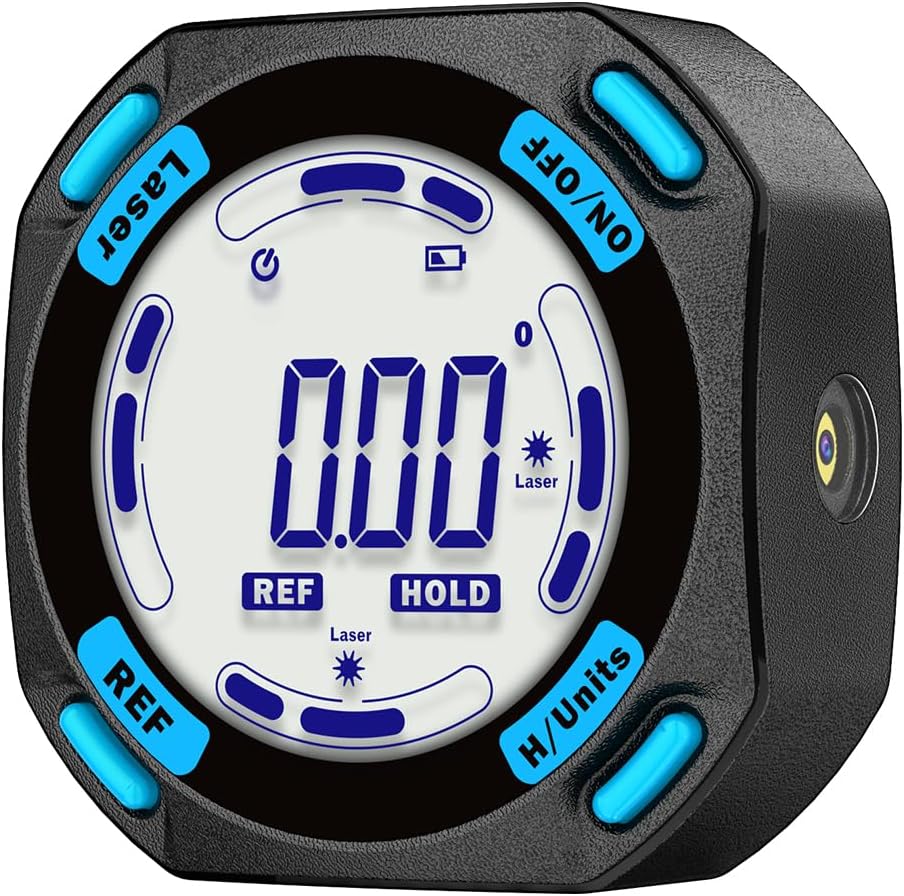 MULTIPLE USES — This tool has the functions of digital level, angle finder and laser lines(Class II, Output<1mW). Visible measurement value avoids staring at the bubbles in the traditional tube and quickly obtains the level status. Two built-in laser liners are convenient and effective to carry out the horizontal and symmetrical work of home decoration. The REF button can effectively realize absolute or relative angle measurement.