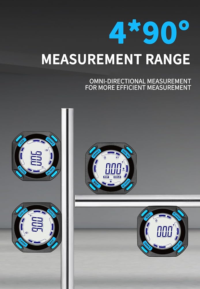 PROVIDE ACCURACY & CONVENIENT — 360°/4×90° measure angle, the measured value on the display is automatically adjusted. The hold button can memorize the measured values is convenient for taking measurements in narrow spaces, inverted situations, and curved pipes. Display value flipped automatically when mounted upside down, with ±0.2° accuracy and 0.05° resolution to ensure accurate measurement every time.