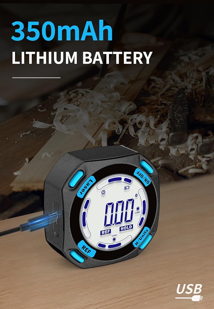 BACKLIGHT LCD DISPLAY — Digital angle finder with an easy-to-read display for clear measurement results in any lighting conditions. The palm-sized, compact design of the angle gauge is easy to carry with a black belt loop storage bag, no matter whether indoors or outdoors is convenient to use. 350mAh, rechargeable, ultra-long standby time, the power display for easy charging in time.