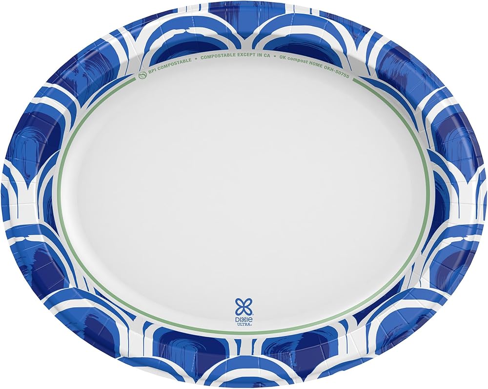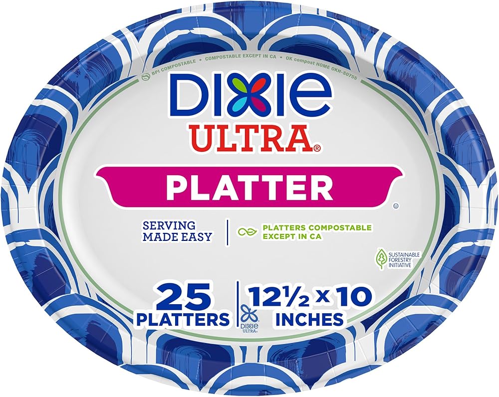 Dixie Ultra® Heavy-Duty Paper Platters* with fresh new designs are the go-to choice for serving everything from charcuterie spreads to prime rib, roast beef or a mouthwatering turkey. Perfect for holidays, dinners, or any special occasion, these large paper platters provide a spacious, stylish serving solution that makes your meals look as good as they taste. Designed to handle even the heaviest, messiest meals with ease, they're microwavable, cut-resistant, and feature a Soak-Proof Shield™. Stock up today! Compostable except in California. If you don't have a dedicated area in your home or backyard for composting, Dixie® oval paper platters may be commercially composted where facilities are available. *Dixie paper plates, bowls, and platters manufactured in Georgia-Pacific facilities are kosher certified by the Orthodox union.