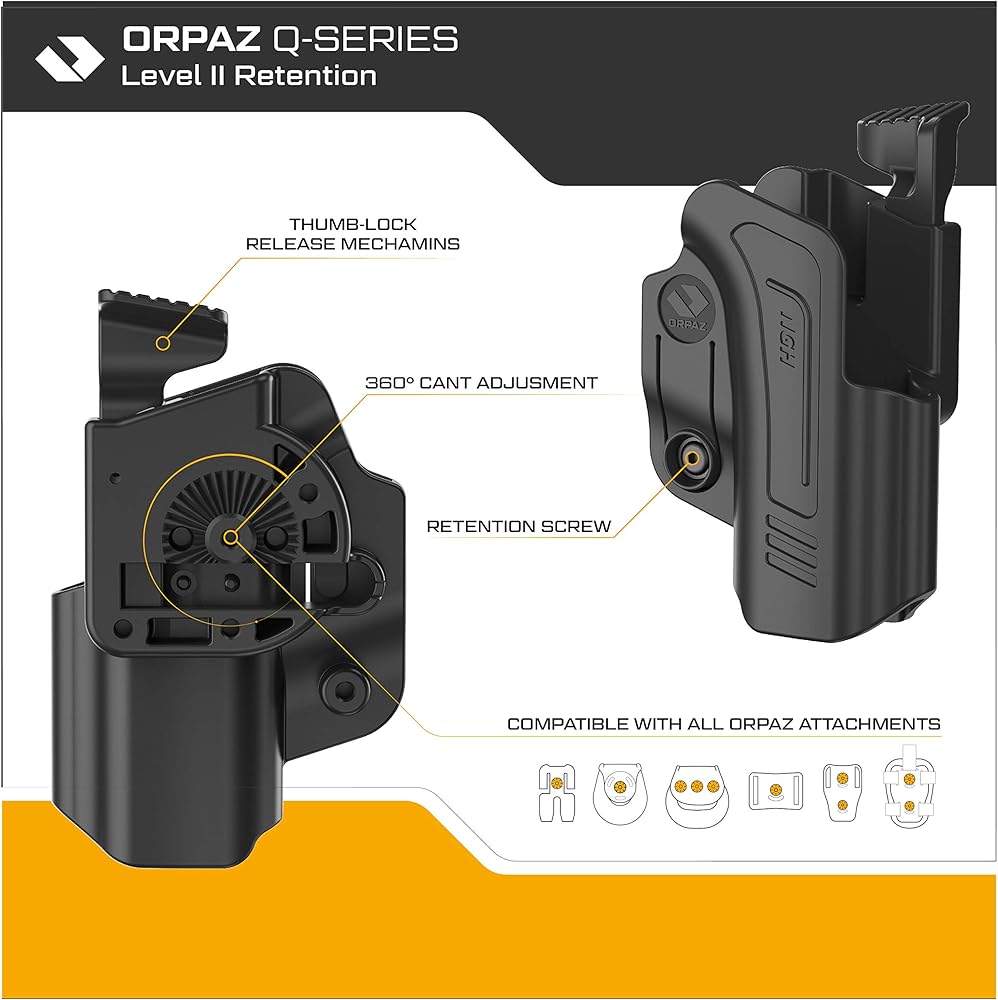 𝗠𝗼𝗱𝘂𝗹𝗮𝗿 𝗮𝗻𝗱 𝗖𝘂𝘀𝘁𝗼𝗺𝗶𝘇𝗮𝗯𝗹𝗲: Fully adjustable cant and retention. Compatible with all Orpaz attachments for belt, paddle, low-ride, drop-leg, MOLLE or Paddle with Magazine Holster. Fits common pistol accessories like sights and scopes.
