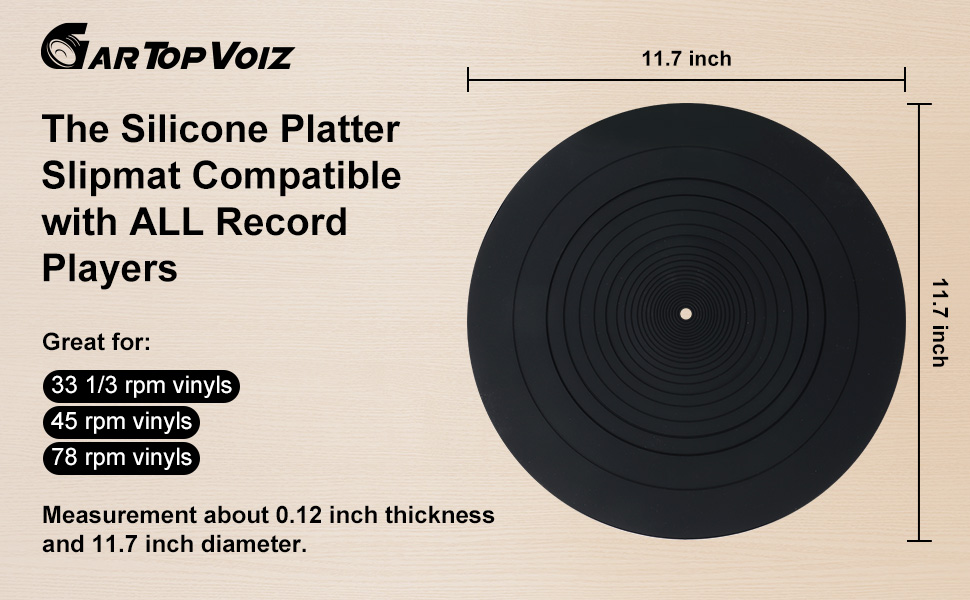 Fitable for all kinds of turntables(33 1/3rpm, 45rpm). The size is 12 inch diameter, 0.18 inch thickness.