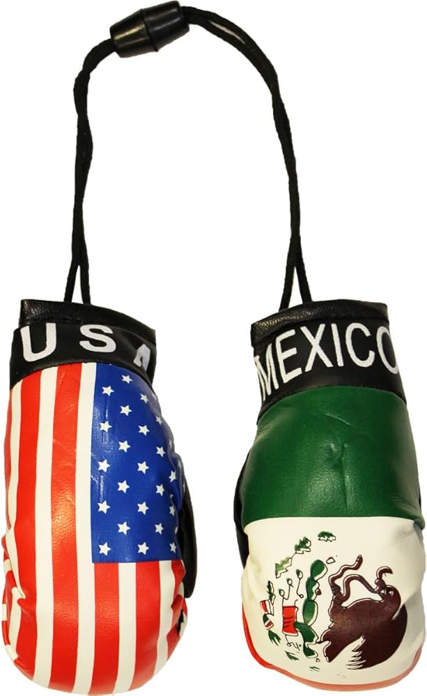 Our vinyl mini boxing gloves are a great way to show your pride, and look stylish hanging from your rear view mirror. The two gloves are connected with a plastic snap so they can easily be displayed together or apart. This set includes one USA glove and one Mexico glove.