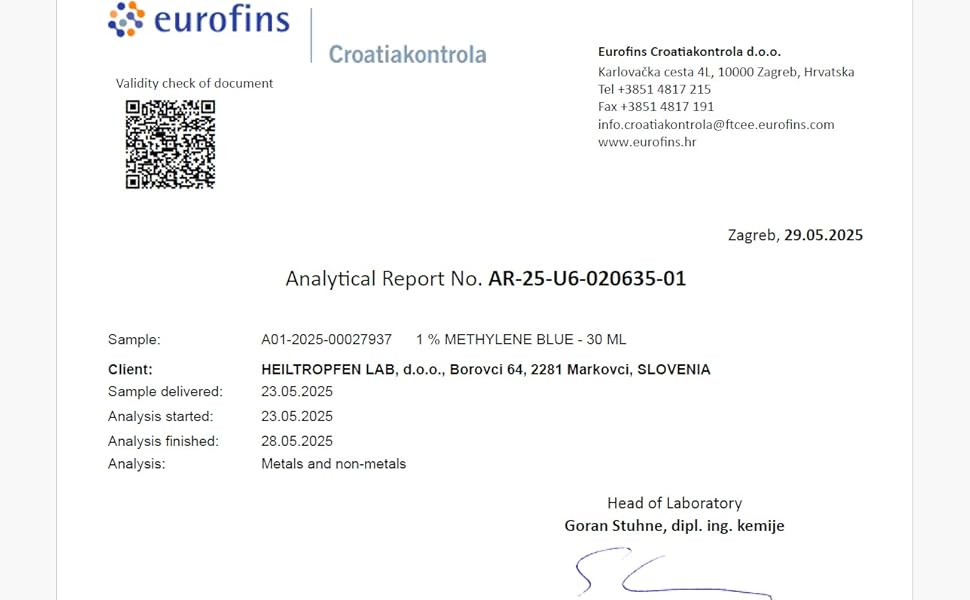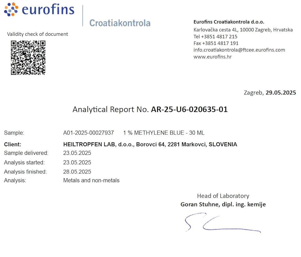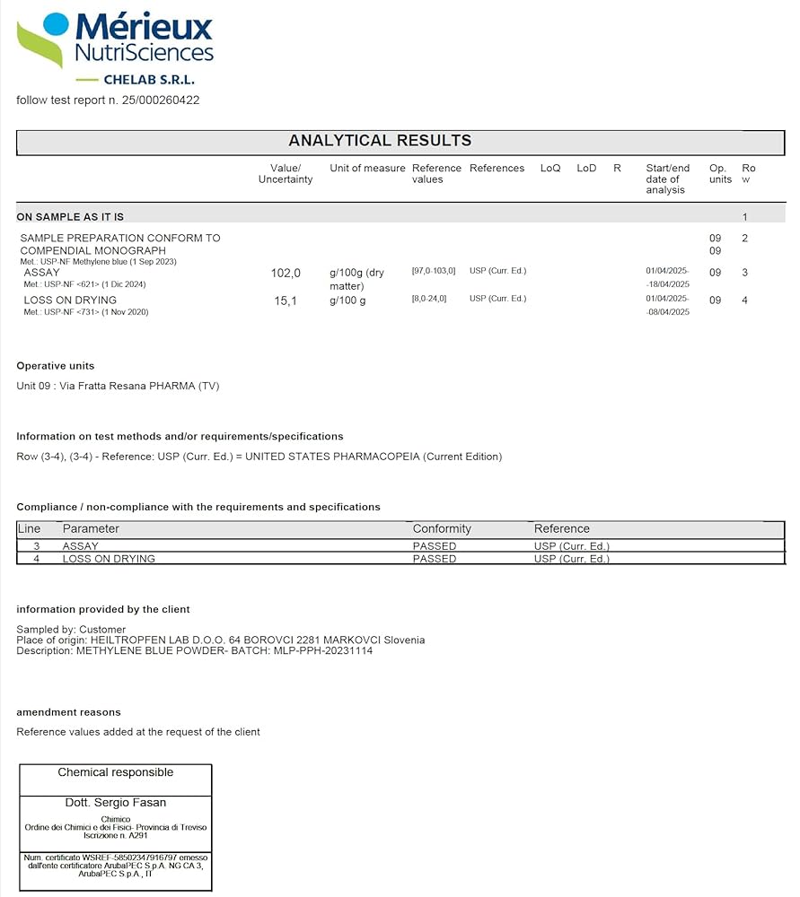 Third-Party Tested for Heavy Metal Contamination and microbiology. Upon request, a heavy metal analysis and microbiology analysis will be provided. Our product meets and exceeds USP requirements. Third-Party (USP) United States Pharmacopeia verified methylene blue incl. certificate.
