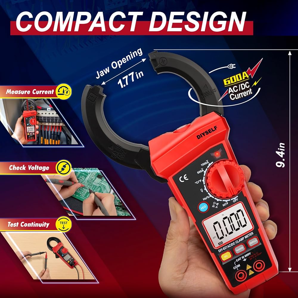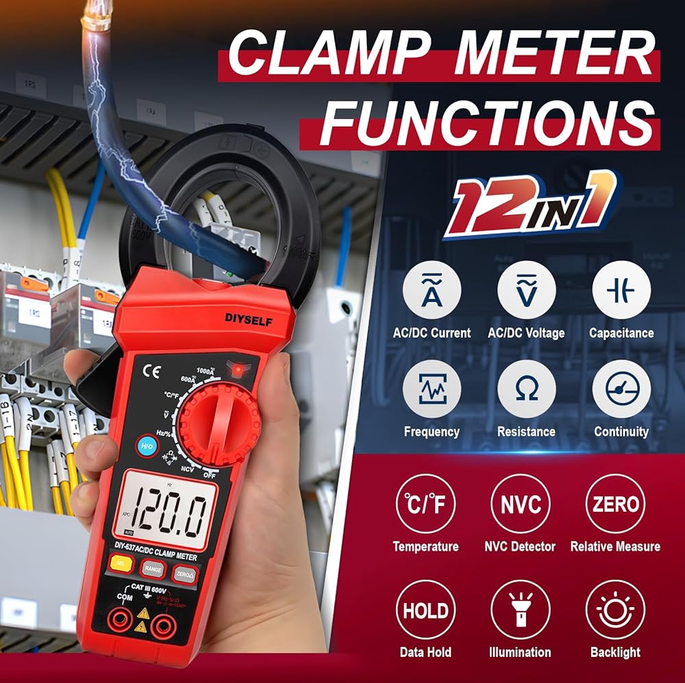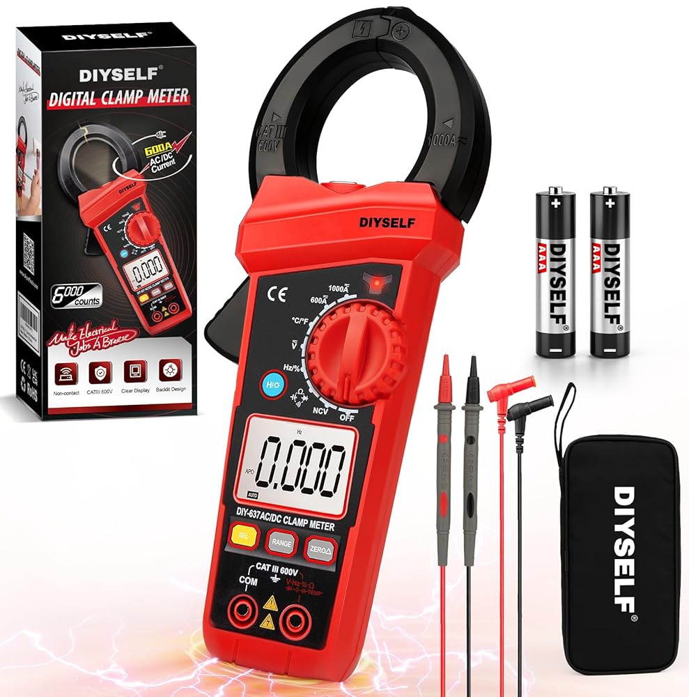 DIYSELF 6000 Counts Digital Clamp Meter, True RMS AC/DC Voltage Tester, Amp Meter Capacitance Meter, Resistance Continuity Tester, Professional Multimeter with Test Leads Pouch and Batteries