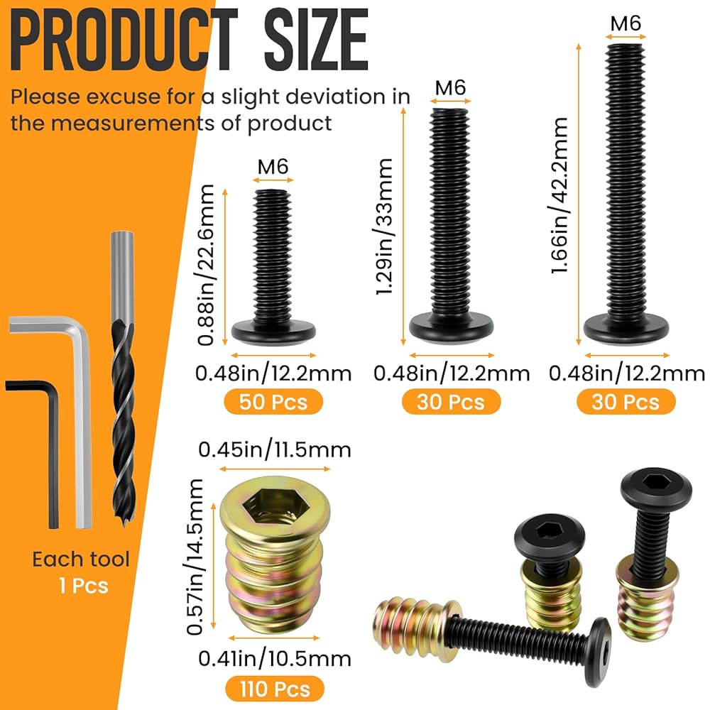 𝐏𝐚𝐜𝐤𝐚𝐠𝐞 𝐈𝐧𝐜𝐥𝐮𝐝𝐞𝐬: 50pcs M6x25/32" insert screws, 30pcs M6x1-3/16" insert screws, 30pcs M6x1-9/16" insert screws, 110pcs M6x19/32" nuts, 2pcs hex socket wrenches (black + white zinc), and 1pcs woodworking drill bit