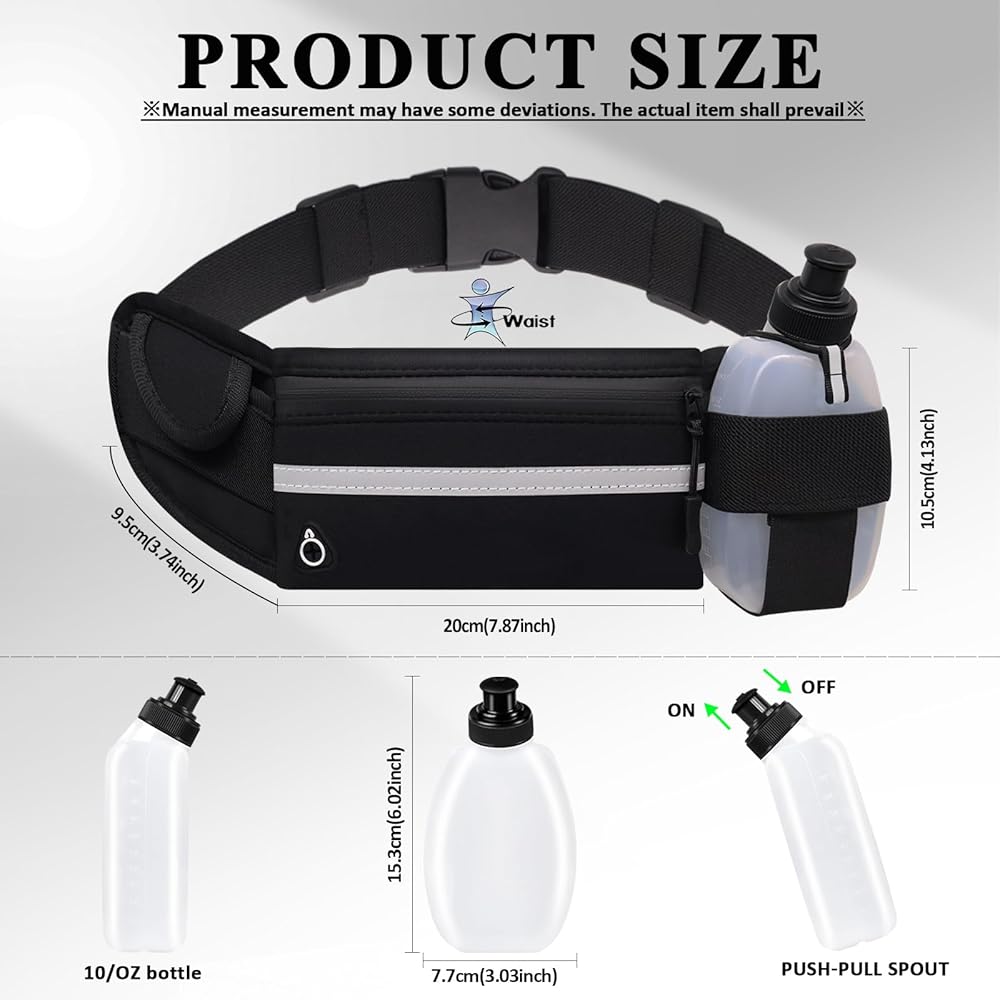Includes one 10oz (approx. 300ml) leak-proof water bottle designed to fit snugly in the dedicated holster,water bottle fanny pack extender strap.