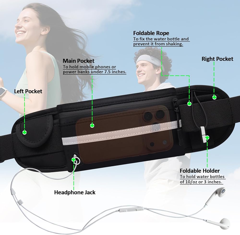Ultra Light & No Slip & Adjustable StrapThe belt bag of this running pouch running waist belt is ultra slim and lightweight.The high elastic waist belt strap is flexible and adjustable.Stretch can comfortably snug,quick release buckles allow easy access to adjust the belt's length to fit your waist and take on/off.No Bouncing,No Chafing,No Clutter and No Slipping during long run or intense workout.