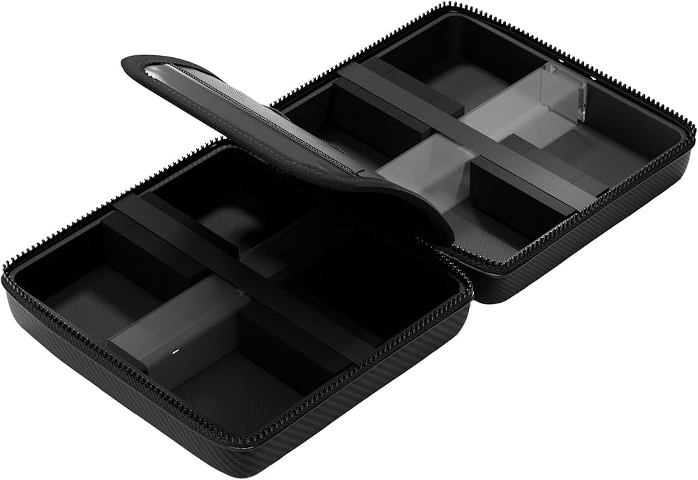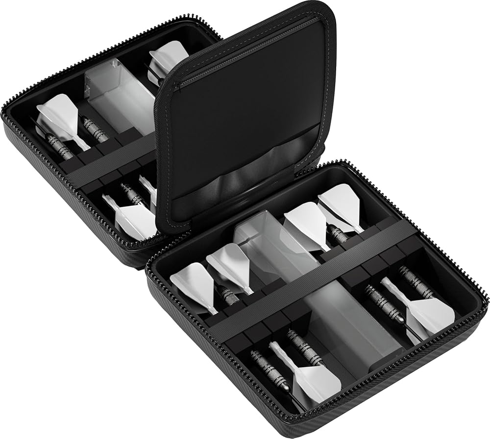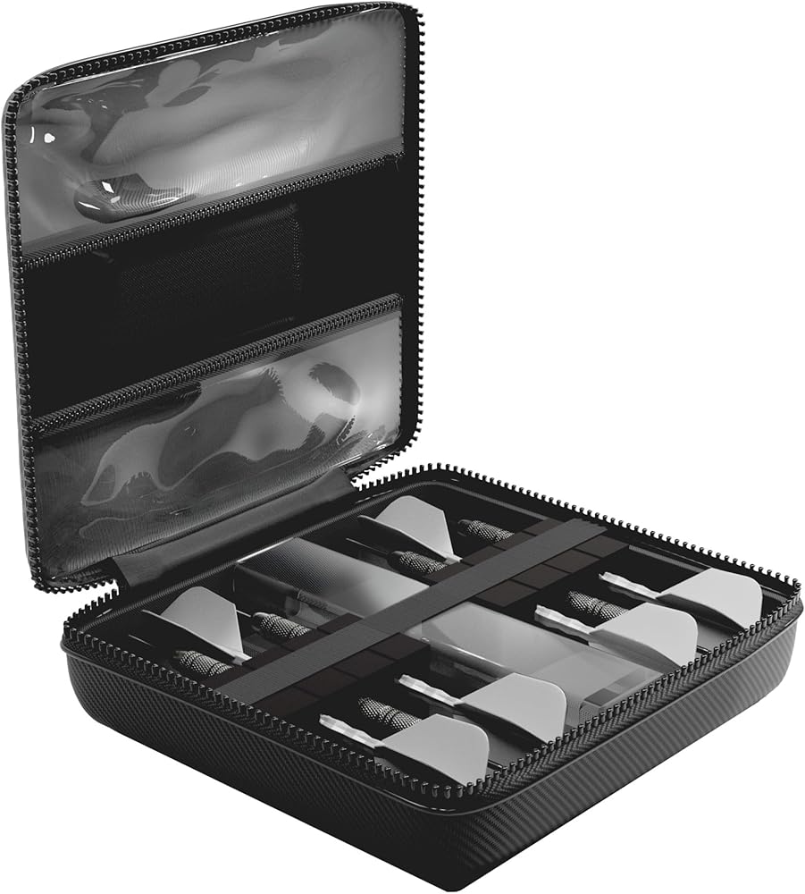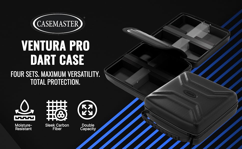 Who This Is For The Casemaster Ventura Pro is designed for serious dart players who carry multiple sets and need maximum storage capacity. Whether you're a league competitor with steel tip darts or a tournament player using soft tip darts, this hard shell dart case holds four complete sets with room for all your accessories. It's the top-tier option in the Ventura lineup for players who demand professional-level organization. How to Use Unzip the strong zipper to reveal the form-fitting foam slots inside. Slide your 12 fully assembled darts into the secure compartments, which hold them in place with an elastic band during transport. Store your molded dart flights and extra dart shafts in the two included square storage tubes to prevent crushing. Use the six flight slots for quick-access backup flights, and the two zippered pockets for additional dart accessories, tips, and personal items. Grab the durable case handle for comfortable carrying. What Sets It Apart The Ventura Pro features a carbon fiber designed exterior that delivers a bold, professional look with low-profile branding. Unlike the standard Ventura and Ventura Plus, the Pro model includes two storage tubes instead of one, six dedicated flight slots, and a durable case handle instead of a wrist strap. At 8 x 8 x 4 inches, it's taller than other Ventura models to accommodate four full dart sets while remaining portable. Product Dimensions 8 in L x 8 in W x 4 in H | Weight: 0.81 lbs.