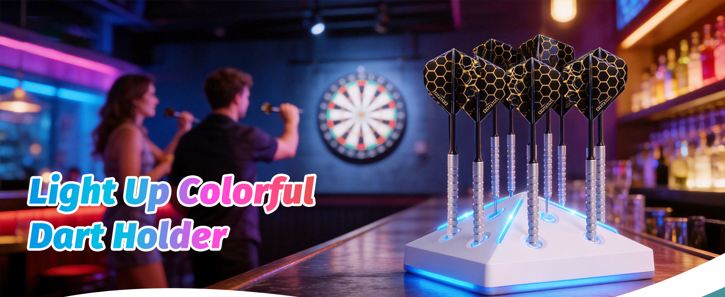 【Customizable Lighting Effects】Elevate your game room with a dynamic dart holder stand with light. Use the remote to choose from 7 single-color static modes or activate the RGB breathing mode. Easily adjust the brightness to create the perfect ambiance.
