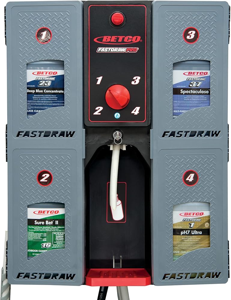Clean efficiently 3-point locking doors help prevent tampering or theft. Durable hinges withstand tough cleaning environments. Designed to fill bottles or buckets from each of its 4 bays. Helps save space. Mounts on flat walls or in a corner. Dilution control dispenser