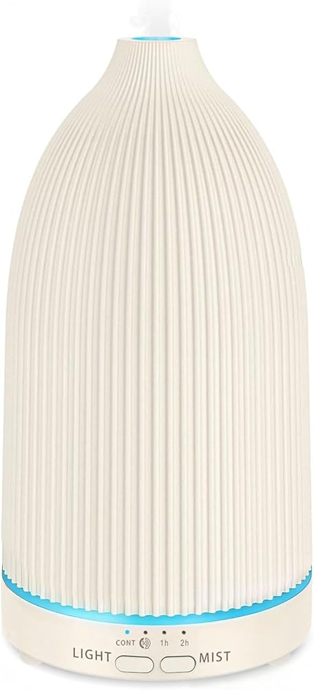 7-Color LED Lights with Customizable Settings – Features soft rotating color-changing LEDs that can be fixed on your favorite hue or turned off completely. The light and mist functions work independently, allowing you to use it as a calming night light without diffusion.