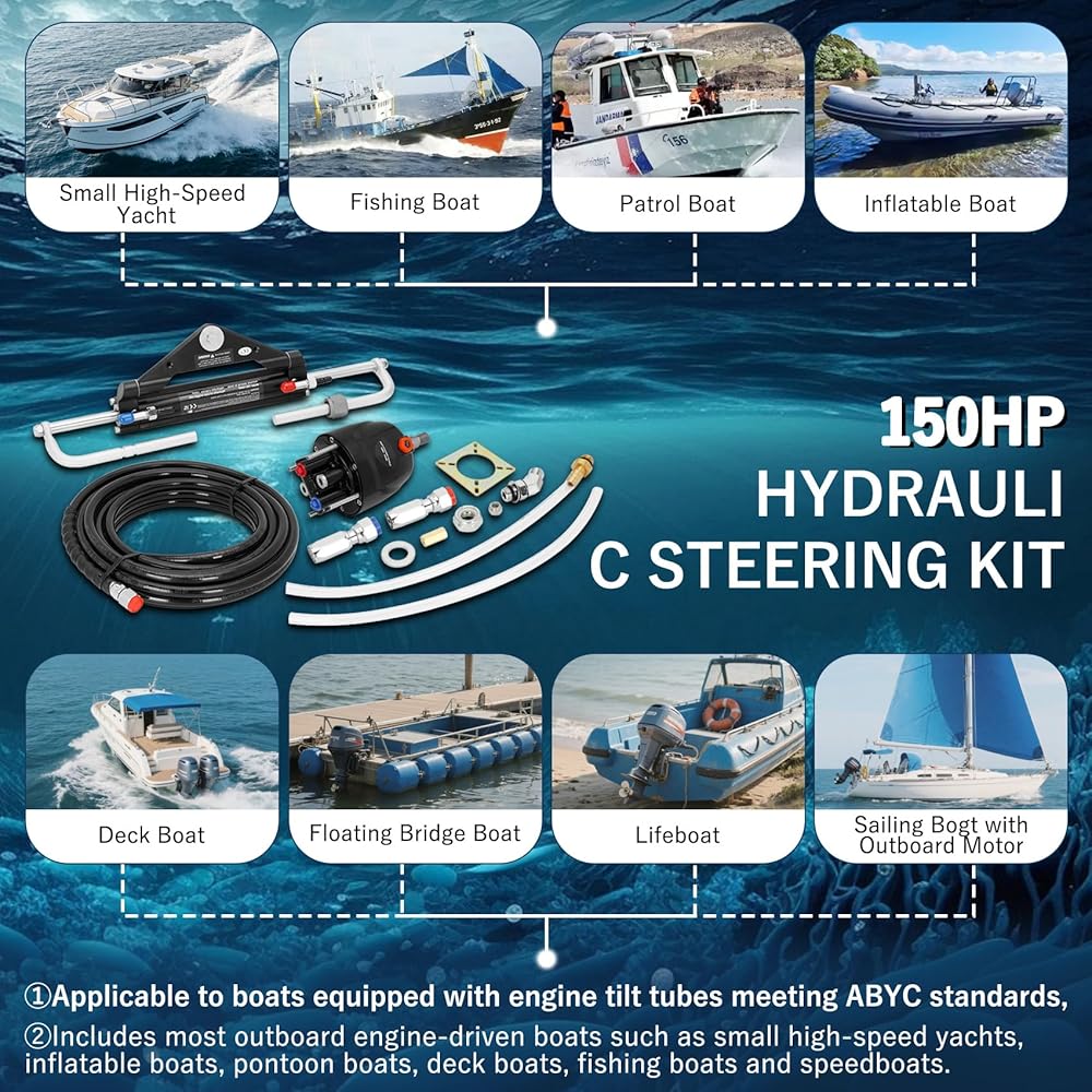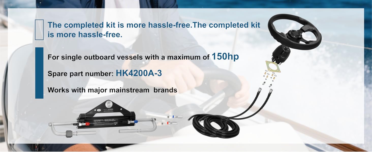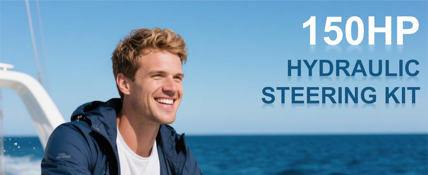 All-In-One Steering Kit: Vikua's 150hp hydraulic outboard kit – has it all for hydraulic steering for boats: hydraulic cylinder, helm pump, steering wheel, 20ft steel-reinforced hoses, and installation parts. Ready to install for single-station boats up to 150HP.