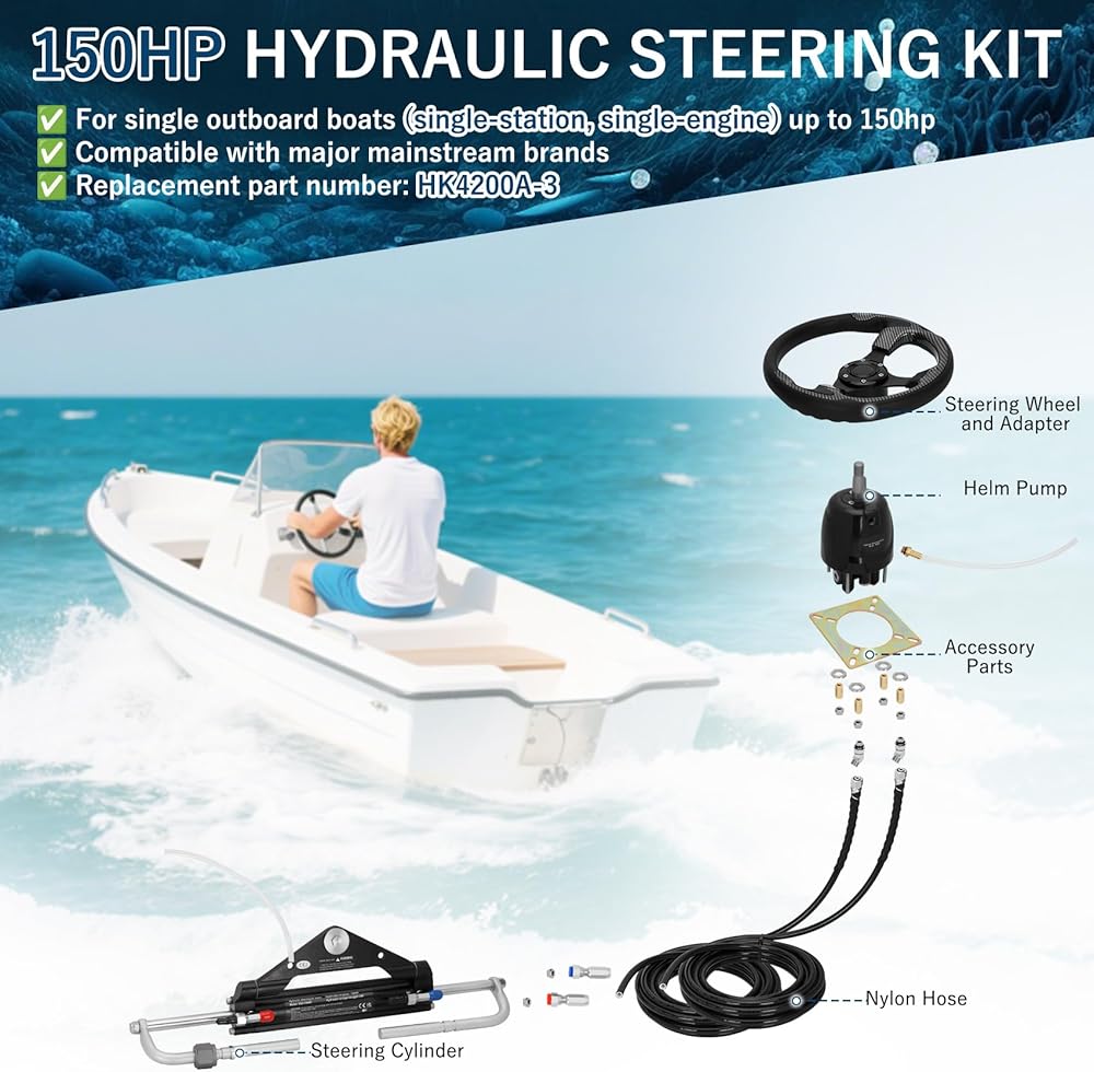 Vikua 150hp Hydraulic Outboard Steering Kit with Steering Wheel, Cylinder, Helm Pump, Hoses, and Installation Parts – A Complete Boat Hydraulic Steering System for Single Engine Boats