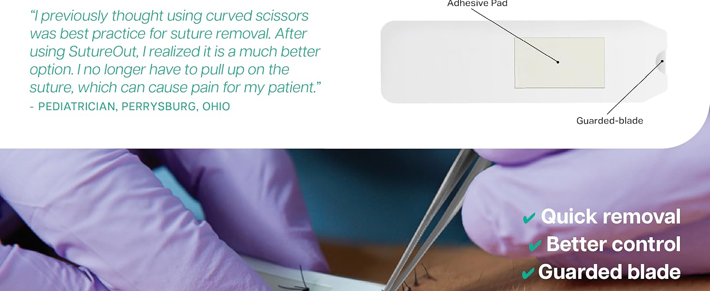 COMPLETE SOLUTION: SutureOut combines the function of traditional suture removal tools in a single-use, disposable, and easy-to-use device designed for efficiency.