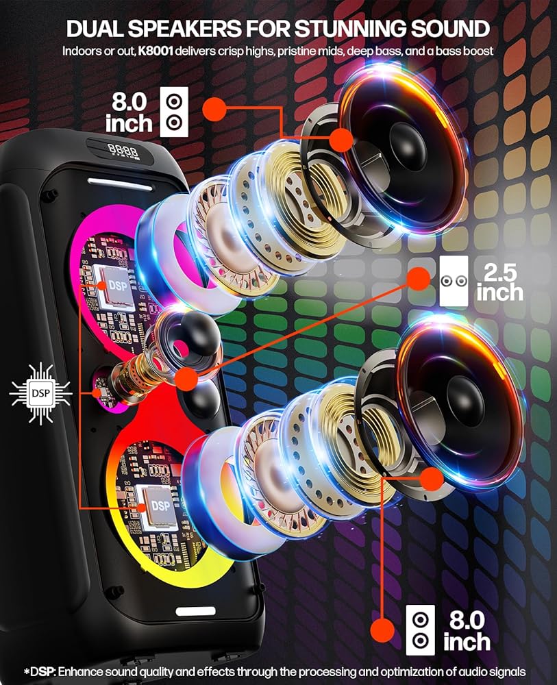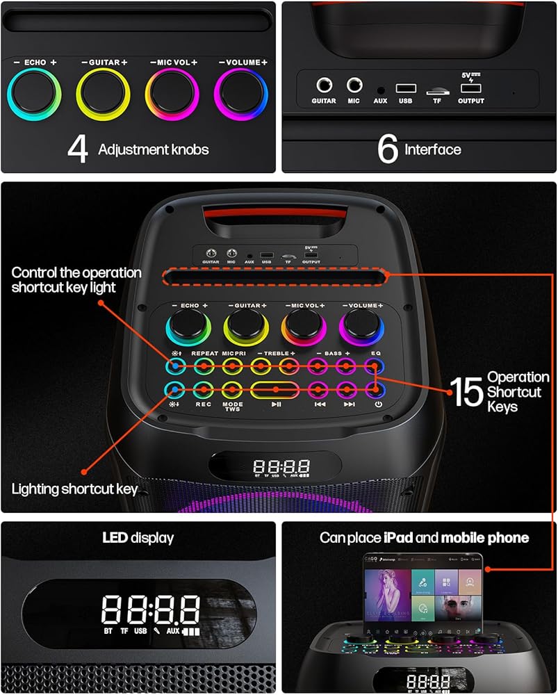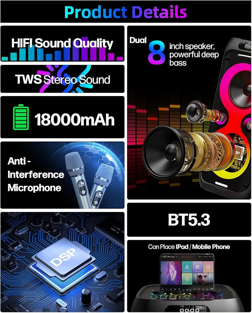 Premium Sound with Custom EQ :Experience room-filling audio powered by dual 8-inch woofers and dual 2.5-inch tweeters, delivering a rich, balanced, and immersive soundstage. Unlike basic speakers, our system features dedicated bass, treble, microphone volume, and ECHO control knobs, allowing you to fine-tune the audio and vocal effects to match your unique style—whether you're a power vocalist or a casual singer.