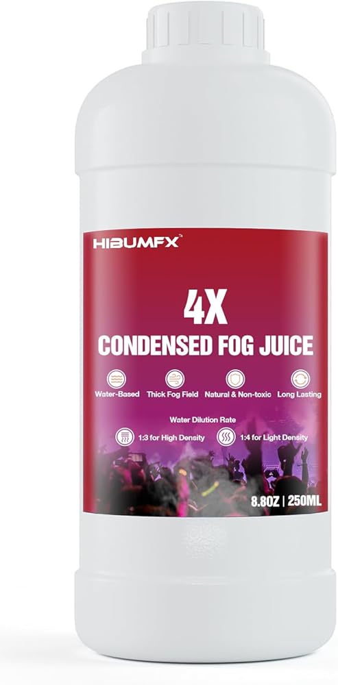 Cost-effective,user-friendly,environmental-friendly condensed fog juice. Contains 0.25 litre Perfect to mix with tap water for various fog effect-high density, medium density or haze fog for different needs. Ideal water mixture ratio is for 0.25 litre fog fluid to 1 liters water for high density fluid.