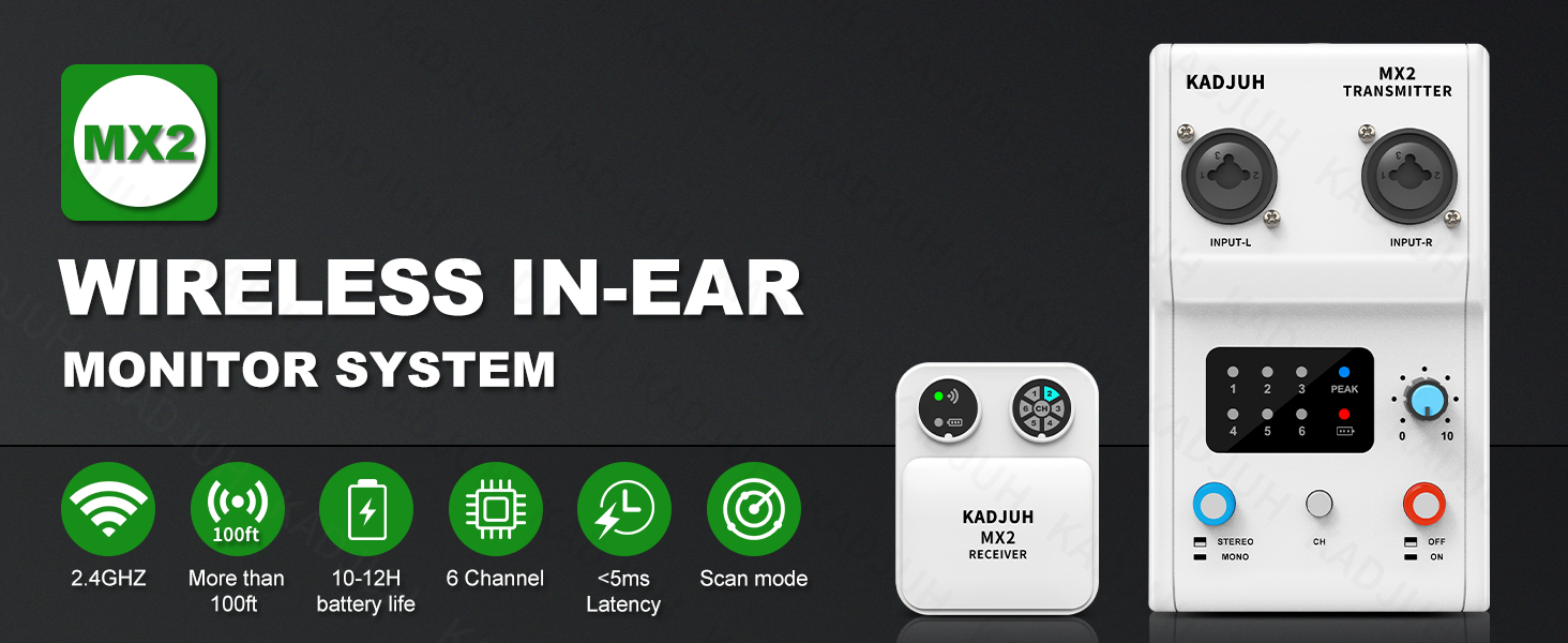 [2.4GHz Wireless IEM] The MX2 Wireless In-Ear Monitor System is an ideal upgrade for your band's on-stage monitoring setup! Featuring 100 ft reception range, all while maintaining signal integrity, zero feedback, and ultra-fast response times! Push a single button to switch between the mono/stereo input, providing smooth frequency response compatibility with any headphones or IEMs.