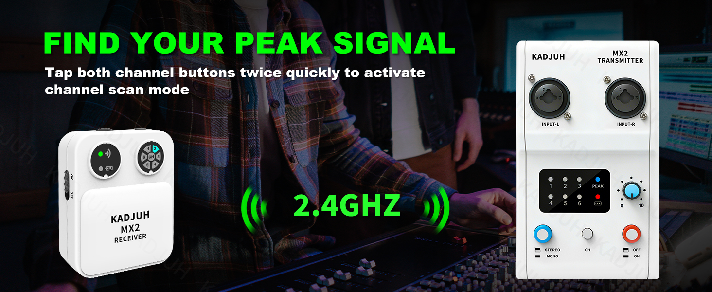 [Find Your Peak Signal] Take it out of your pocket, plug it in, turn on the power and you are ready to go! Tap both channel buttons twice quickly to activate channel scan mode. The transmitter's LED will flash during scanning and then remain steady on the best wireless channel. First, set the transmitter's channel, then set the receiver's channel to match it.