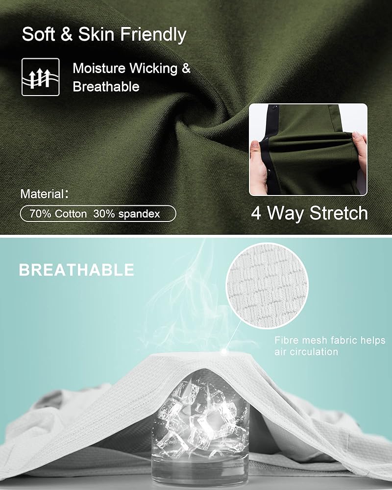 🏀 Moisture Wicking & 4 Way Stretch: Soft and skin-friendly cotton material, breathable and not stuffy, wicking sweat in time. In particular, 30% spandex is added to the cotton fabric to increase elasticity, prevent noise, and be more suitable for sports