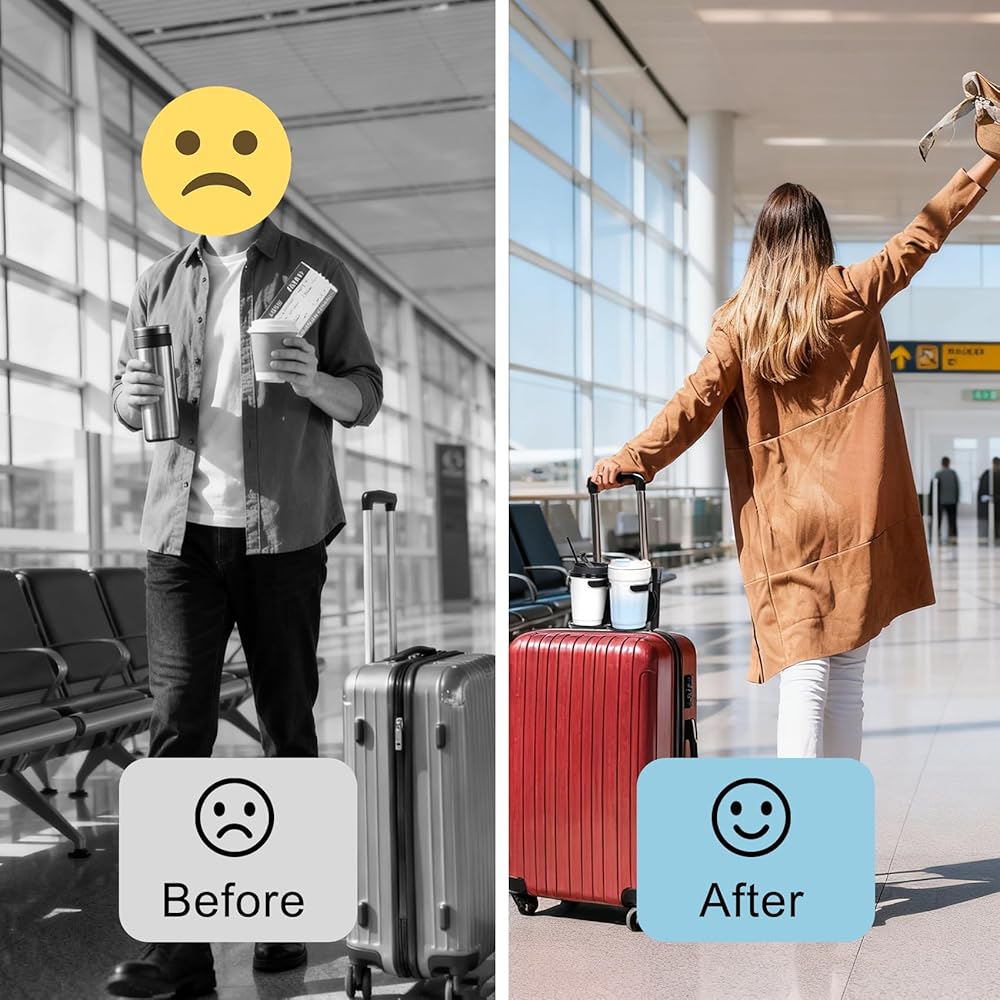 Free Hands & Travel Effortlessly: This cup holder attaches securely to your suitcase handle, freeing your hands for phones, tickets or kids. Move through airports, hotels, and streets with smooth, uninterrupted ease