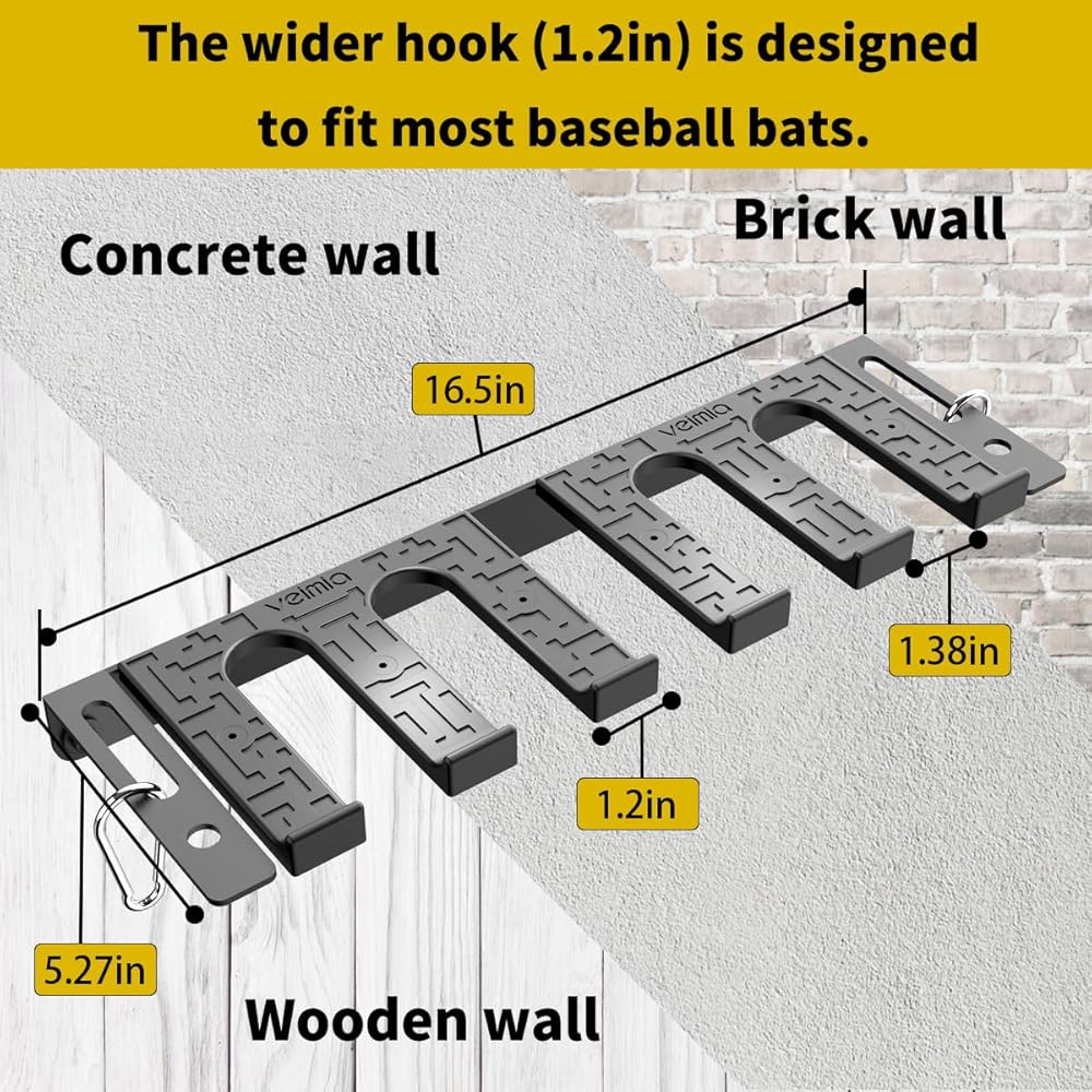 [Easy to install]: Please refer to our installation instructions, it only needs a few minutes to complete the installation. 1.38in wide hole distance can hold most sizes of baseballs. Please measure the diameter of your bats before purchase to avoid improper size.