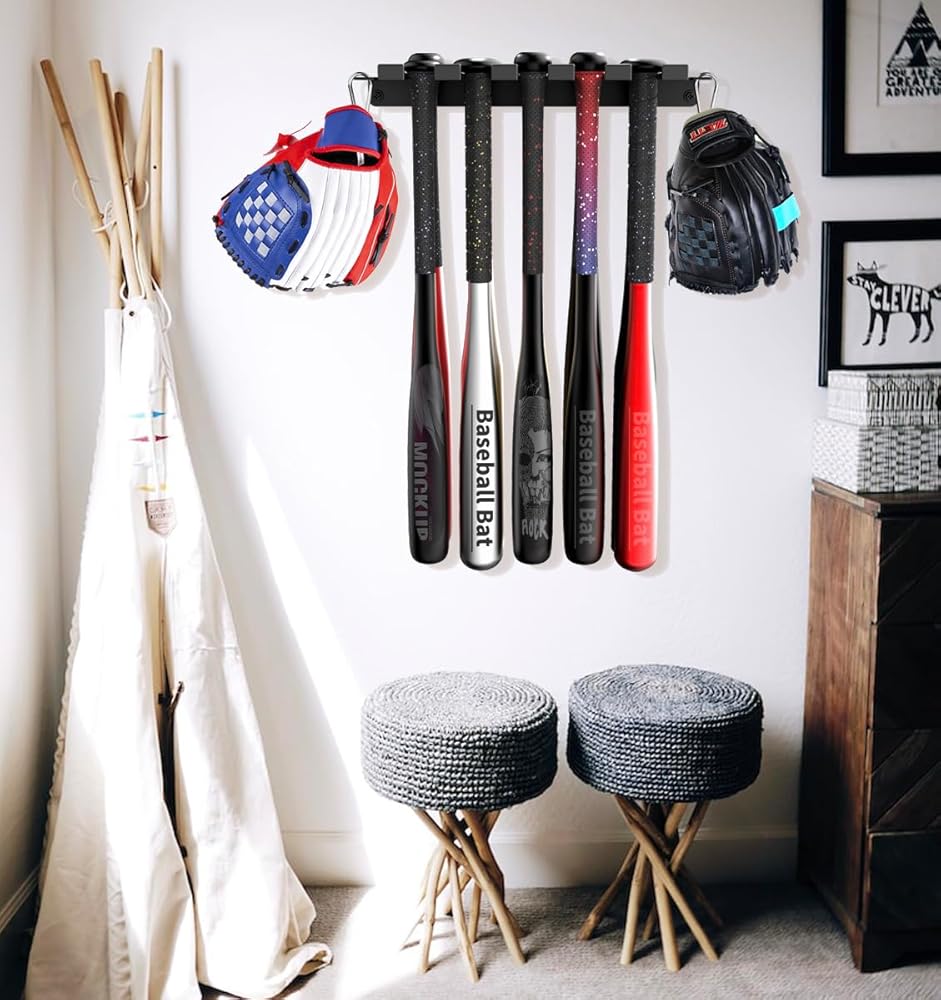 [Why to buy] Hard metal texture baseball bat storage rack can be firmly fixed on the wall. Special rubber mat design can avoid damage between baseball bat and rack due to collision.