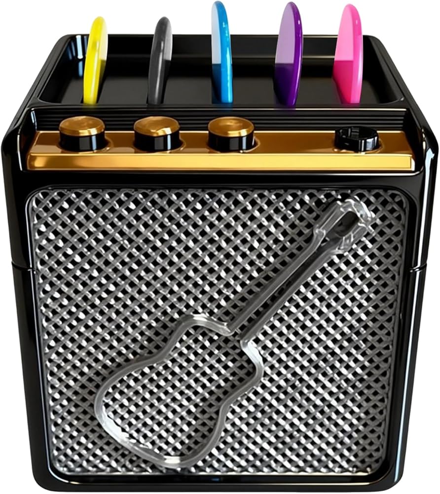 Mini Speaker Pick Rack—Cool Desktop Display:This palm-sized mini guitar speaker pick rack is 3D-printed from durable PVC, featuring a realistic speaker grille and control knobs. The hollow speaker body clearly displays 1-5 picks within easy reach, instantly transforming your desk, effects pedalboard, or studio into a rock stage.
