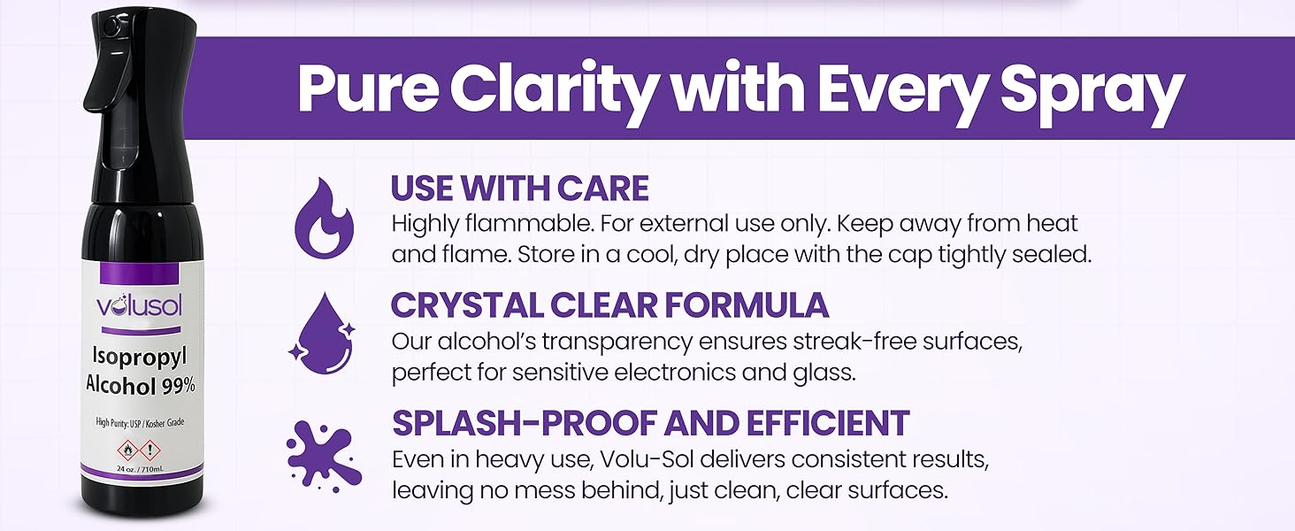 Volu-Sol 99% Isopropyl Alcohol Spray – Continuous Fine Mist Pure IPA 99% Rubbing Alcohol Spray Bottle – USP & Kosher Certified Formula for Electronics, Home & Industrial Use (24 Oz)