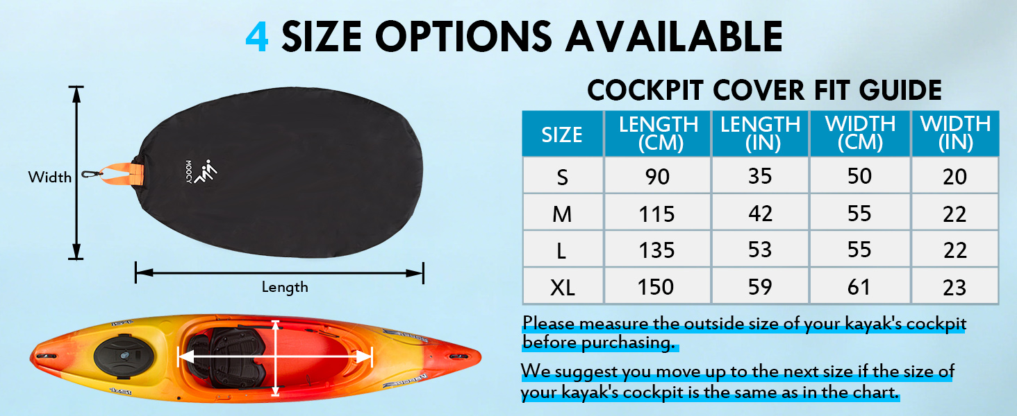 [ABOUT SIZE] There are 4 sizes to choose from, S=35x20''(LxW) ;M=42x22''(LxW); L=53x22''(LxW); XL=59x23''(LxW).Note:Pls measure the size of your kayak's cockpit before purchasing and please refer to the size chart carefully to choose the right size for your kayak.