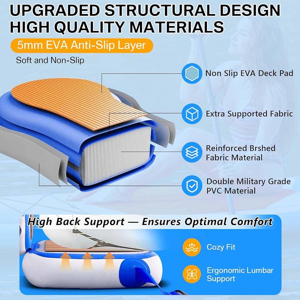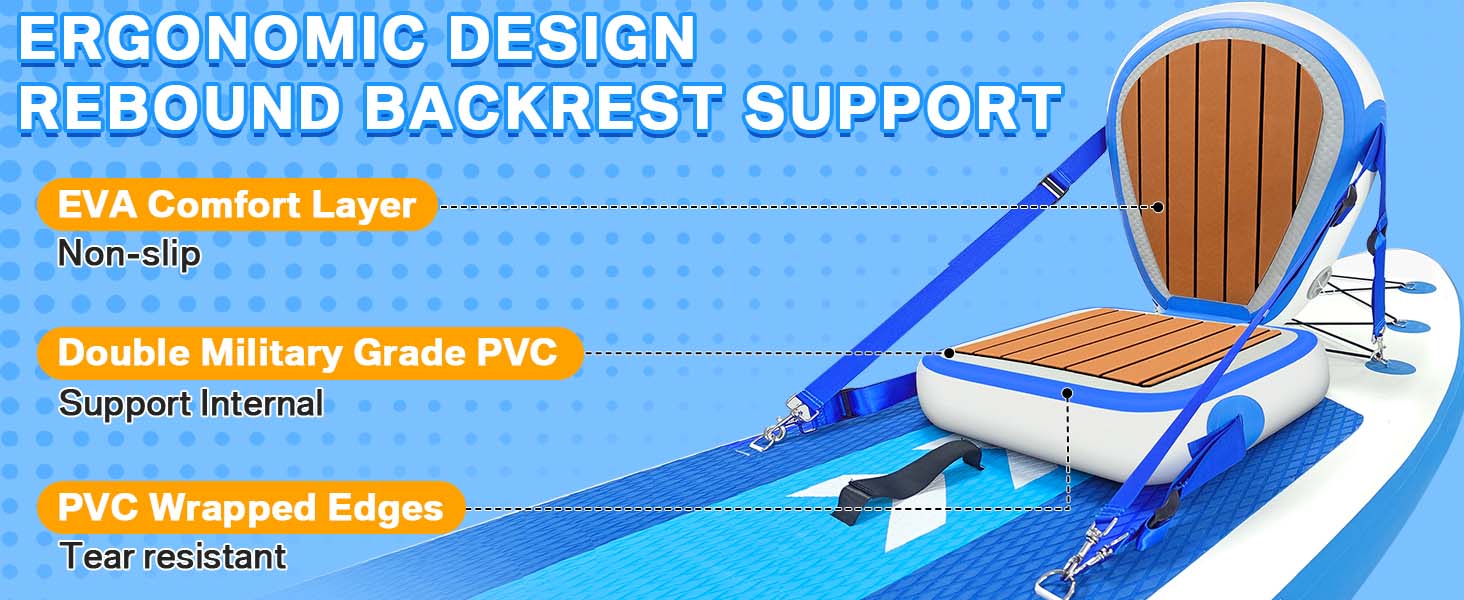 【Anti-slip EVA pads】: The surface of the seat is made of a soft EVA material, an old partner of PVC material. It provides you with a non-slip surface that makes you safer when you are on the water, as well as a comfortable and soft surface that won't make you feel uncomfortable when you use it for a long time. The backrest is also made of EVA, making it more comfortable to lean on.