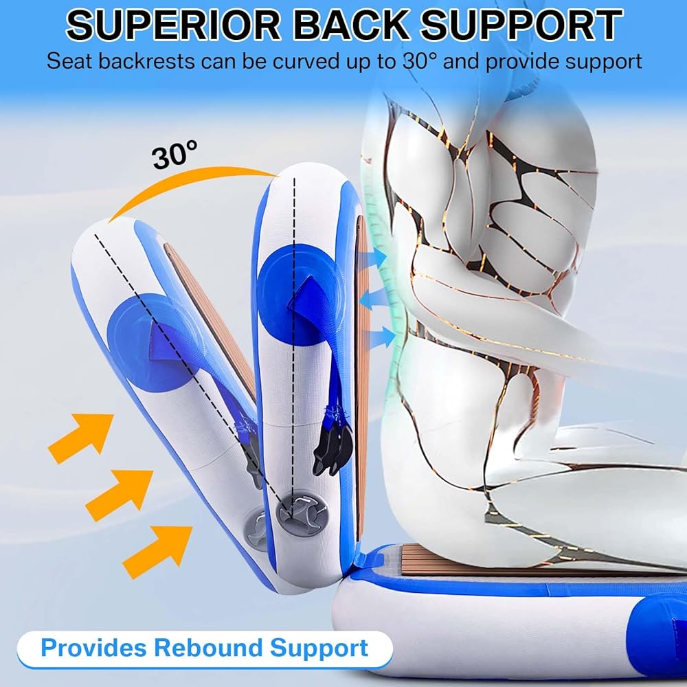 【Raised Seat】The thickness of the inflatable seat is 3.5inch, compared to a normal seat, it allows you to use the seat with your legs better flattened, reduces the squeezing pressure received by the buttocks on the seat, and soothes the fatigue of sitting for a long time. With the soft surface and blunt angle recline, it makes you have a perfect water experience.