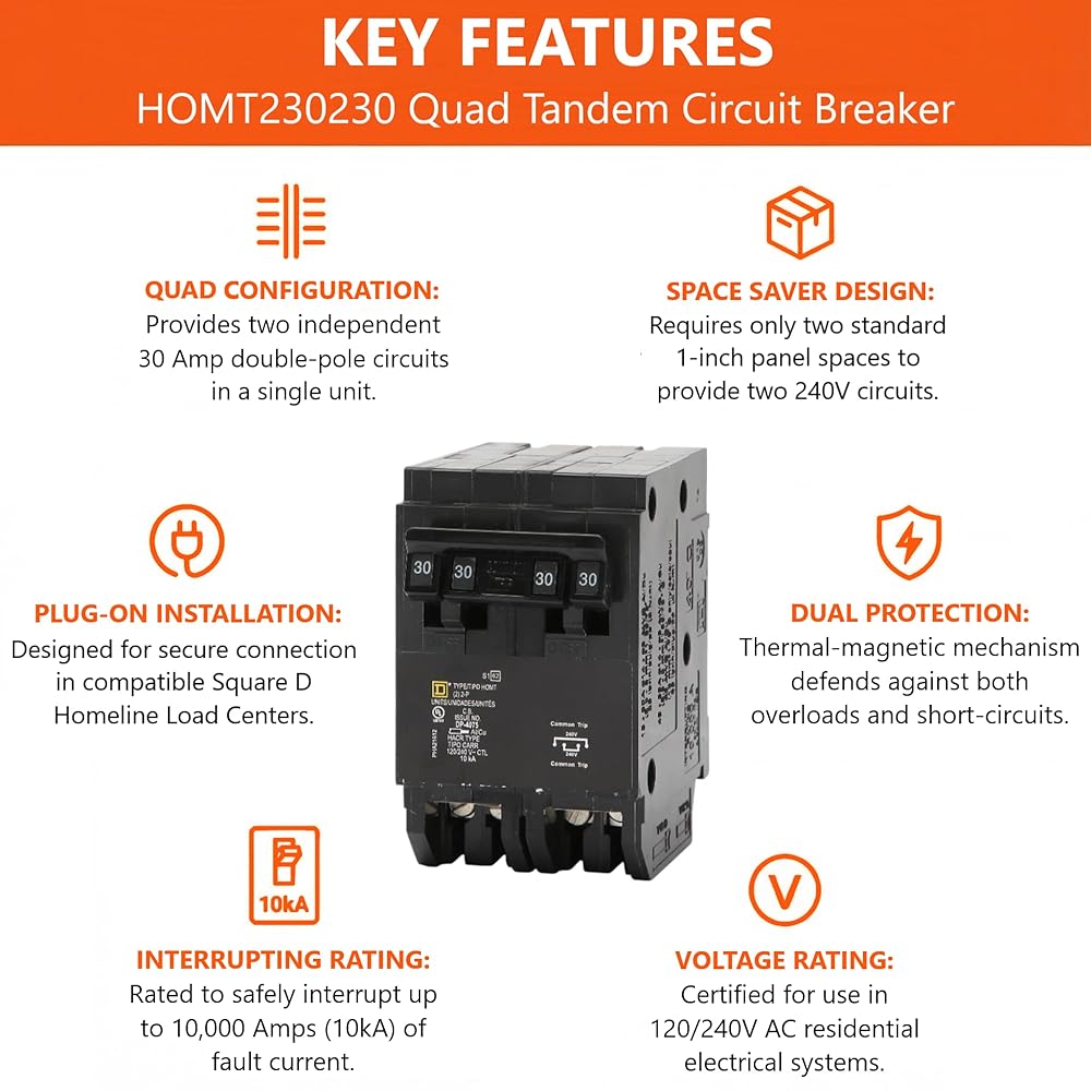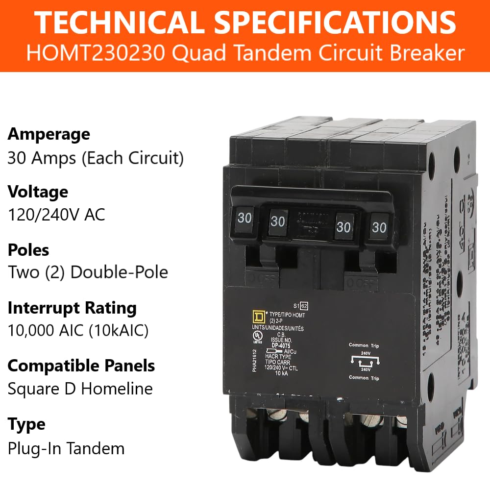 AUTHENTIC OEM COMPONENT — This kit is built around one (1) factory-new, unused, and authentic Original Equipment Manufacturer (OEM) Square D HOMT230230 Quad Tandem circuit breaker. The Homeline series is Square D's industry-standard line for residential circuit protection, engineered for reliability and precise performance. Ideal for increasing circuit density in existing Square D Homeline electrical systems without adding a subpanel.