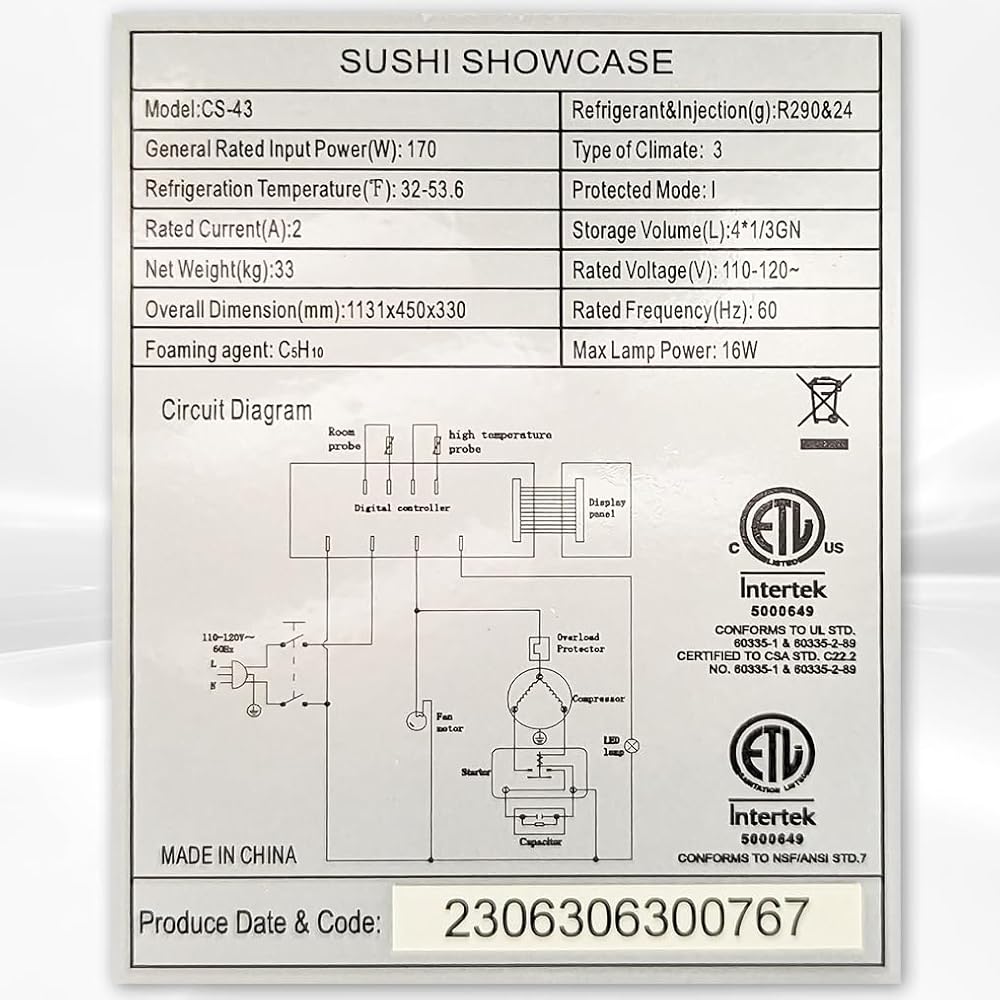 Refrigerated Sushi Display Cooler Case Countertop 4 Pan Commercial Refrigerator ; LED Lighting; 44" Wide NSF ETL cs-43 Overall Dimensions: Dimensions: L44" x D17" x H12". Volume: 42L Voltage: 110V/60HZ. Refrigerant: R290 Cold temperature 32°F~53.6°F.Digital Temperature Control Built-In digital temperature control is located in the rear of the machine. It is simple to control with an easy to read display, and ensures your case is kept at the ideal temperature for its contents. Designed to sit on your sushi bar, this case is perfect for showcasing your delicious offerings right where your patrons can see them at eye level. In addition to sushi, this case is also great to display your high-end meats and cheeses. This case can hold up to 4 pans, included with the unit, and has LED lighting to illuminate the contents of the case. Not only does LED lighting provide a clean, white light, it is also energy efficient and does not create any heat inside of the cabinet. Sleek Design A bright white body, paired with the curved, tempered glass front, make this a sleek and modern approach to food display while also allowing the food itself to be the center of attention.