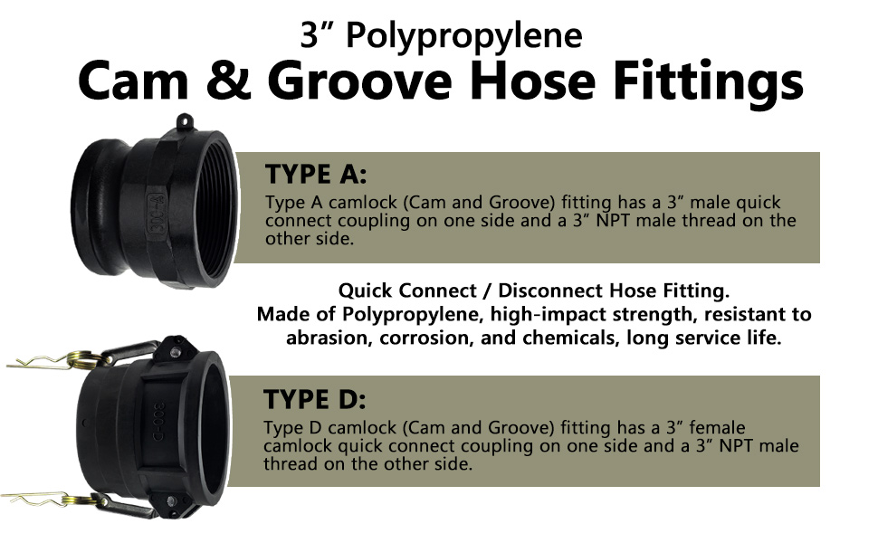 3 inch Polypropylene Cam & Groove Hose Fittings: Quick Connect / Disconnect Hose Fitting. Made of Polypropylene, high-impact strength, resistant to abrasion, corrosion, and chemicals, long service life